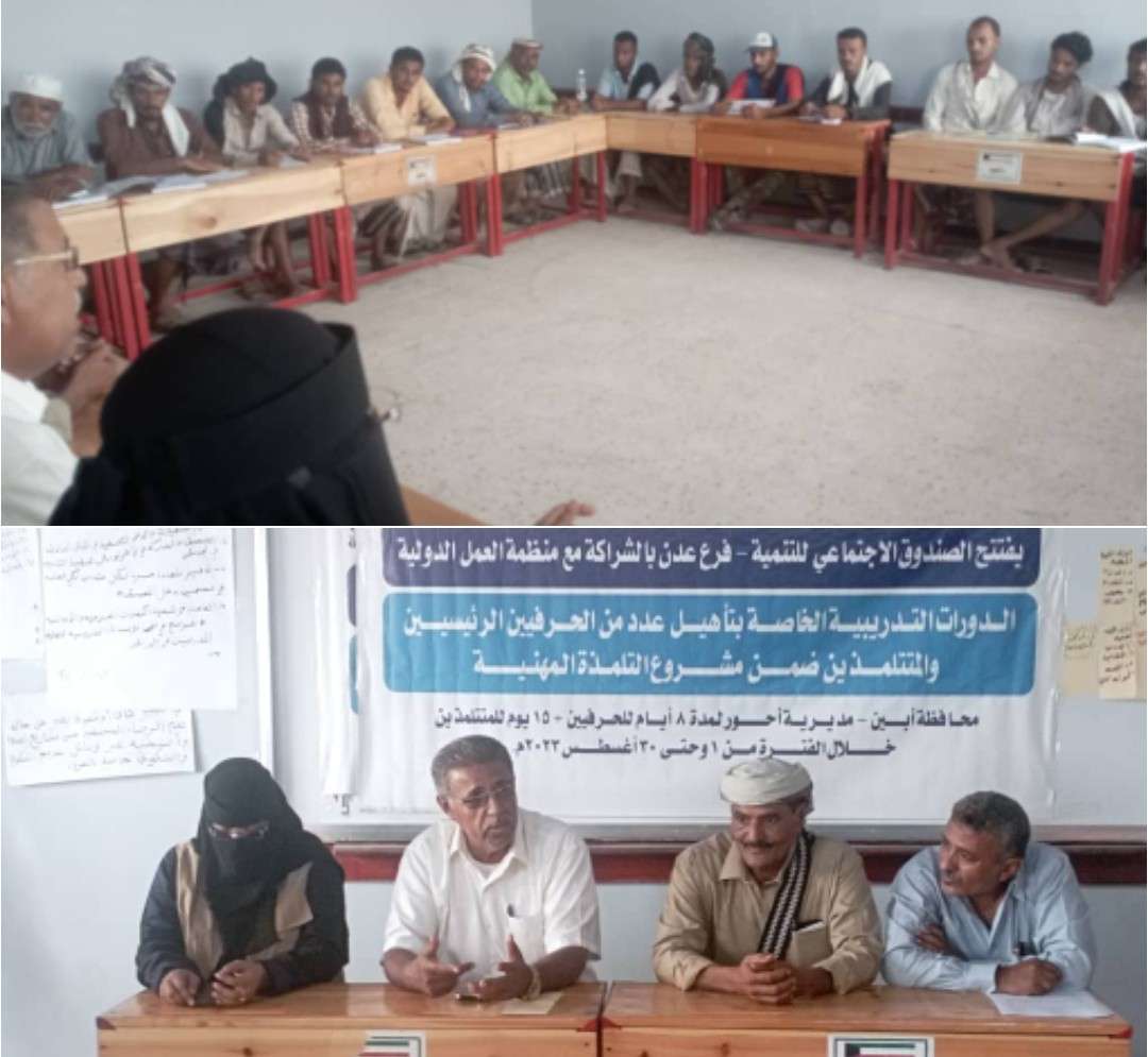 برعاية محافظ محافظة أبين اللواء بوبكر حسين وفي إطار خطة مكتب التعليم الفني والتدريب المهني بابين، وتنفيذ الصندوق الاجتماعي بالشراكة مع منظمة العمل الدولي افتتح الصندوق الاجتماعي للتنمية فرع عدن بالشراكة مع منظمة العمل الدولية الدورات التدريبية الخاصة بتأهيل عدد من الحرفيين الرئيسيين والمتتلمذين ضمن مشروع التلمذة المهنية في مديرية احور وبتكليف من مدير عام مديرية احور العقيد احمد مهدي دشن رئيس لجنة الخدمات في السلطة المحلية الاستاذ الهندي صالح عوض والمهندس مهدي الجحيني مدير عام التعليم الفني والتدريب المهني محافظة أبين والاستاذه ريام الشحيري منسق المشروع ، دشنوا الدورات التدريبية في عدة برامج في مديرية أحور لمشروع التلميذة المهنية والقيت كلمة السلطة المحلية ألقاها رئيس لجنة الخدمات الاستاذ الهندي صالح عوض رحب بمدير عام التعليم الفني والتدريب المهني في محافظة أبين المهندس مهدي الجحيني وكذا الاستاذة ريام الشحيري المنسقة الميدانية في الصندوق الاجتماعي في محافظة ابين ورحب بجميع المدربين والمشاركين في هذه الدورة وتمنى لجميع المشاركين النجاح في هذه الدورة التي تخدم المديرية وهي الاولى من نوعها في شتى المجالات بالمديرية كما القى مدير عام التعليم الفني والتدريب المهني المهندس مهدي الجحيني كلمة رحب بالسلطة المحلية في المديرية ورحب بجميع الحرفيين والحرفيات في هذه الدورة كما أوضح في كلمته ان مكتب التعليم الفني والتدريب المهني يقوم بتنفيذ المشروع في إطار الخطة 2023 وهي الدورة لاول مرة في مديرية أحور ومديرية لودر بعد الاستكمال للمشروع في مديرية احور سينتقل المشروع إلى مديرية لودر محافظة أبين ، متمنيا التوفيق والنجاح في هذه المشاريع التي تخدم المديرية وشريحة من المشاركين والمشاركات ويشمل المشروع تدريب الحرفيين وعددهم (30) ومدة الدورة 8 ايام ابتداءً من هذا اليوم الثلاثاء الموافق 1/8/2023 وسيتم تدريب المتتلمذين والمتتلمذات وعددهم 75 من الرجال عشرين ومن النساء 10 على ايدي الحرفيين لمدة 5 ايام من الرجال 10 تابعين للنحل و10 لطاقة الشمسية النساء 5 خياطة و5 كوافير وسيتم تدريب 75 على هذه المشاريع من النساء والرجال
