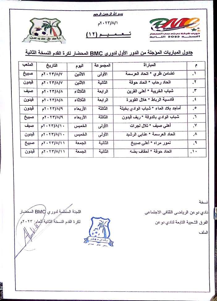 اللجنة المنظمة لدوري BMC المحضار تصدر التعميم رقم 12 بشأن استئناف المباريات المتبقية