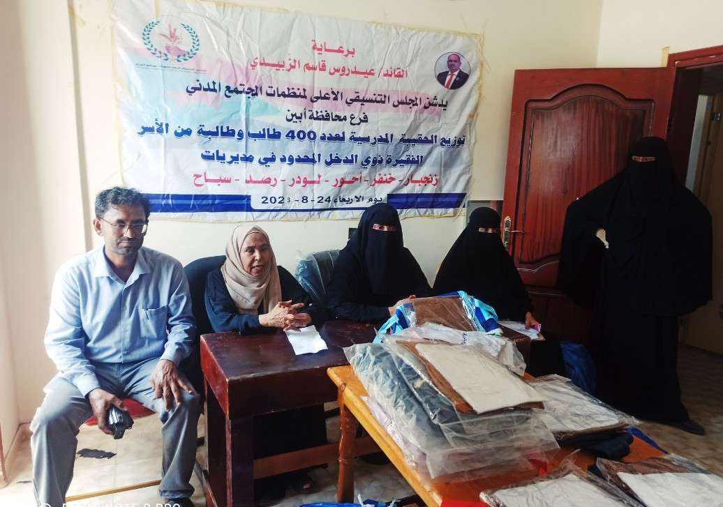 برعاية الرئيس الزُبيدي.. المجلس التنسيقي لمنظمات المجتمع المدني بأبين يدشن مشروع الحقيبة المدرسية.