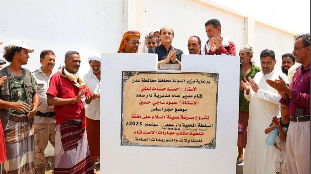تحت رعاية وزير الدولة محافظ العاصمة عدن الأستاذ أحمد حامد لملس_ وضع مدير عام مديرية دارسعد رئيس المجلس المحلي الاستاذ عبود ناجي حسين، صباح اليوم السبت الموافق 2 سبتمبر 2023م ، حجر الأساس لمشروع بناء مدرسة حكومية بمدينة السلام شمال شرق المديرية ويعد هذا المشروع الذي بلغت تكلفته ( 124,846,800 ) ريال يمني، بتمويل ذاتي من السلطة المحلية بمديرية دارسعد، وتنفيذ ( مكتب مهارات الأصدقاء للمقاولات والتوريدات العامة )، لبناء مدرسة حكومية في مدينة السلام عبارة عن طابقين ( دورين )، مكون من " 12" فصل دراسي كمرحلة اولى ، من المشاريع الهامة التي ستعالج كثير من المشاكل المتعلقة بالتعليم. حيث شهدت مدينة السلام خلال العشر السنوات الاخيرة تنامي سكاني كبير، وهذا ما زاد من معانات سكان المدينة والمساكن المجاورة لها، فقد أطر معضم أهالي المدينة لإرسال أولادهم وبناتهم إلى مناطق بعيده عن المدنية للوصول إلى المدارس وتلقي التعليم، بينما لم يتمكن البعض الآخر من تحمل المشقة او التكاليف المترتبة عن تنقل أولادهم وبناتهم من المدينة إلى المناطق المجاورة والعودة، الأمر الذي جعل من بعض أوليا الأمور المتعسرين ( ضعاف الدخل ) إبقاء أولادهم وبناتهم دون الالتحاق بالمدارس ومواصلة التعليم، علما بأن مدينة السلام التي تم تأسيسها مندو اكثر من 15 عام، لا يوجد فيها اي مدارس حكومة حتى اللحظة. حضر التدشين/ عضو الهيئة العليا للجان المجتمعية بدارسعد رئيس انتقالي المدينة الاستاذ محمد علي سيف ، وعدد كبير من اهالي المدينة .