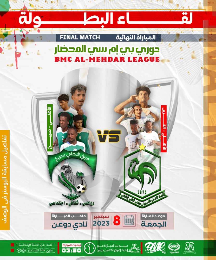 اللجنة المنظمة لدوري BMC المحضار تستكمل كافة التجهيزات لإقامة النهائي يوم الجمعة القادم