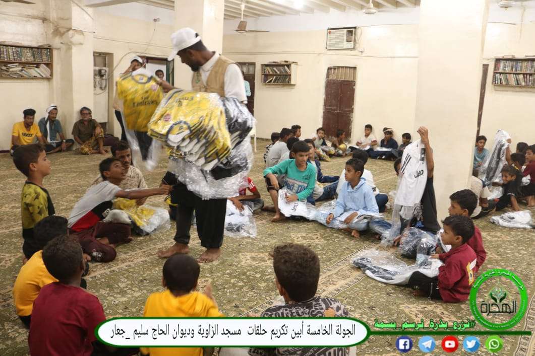 واصلت مؤسسة الهجرة الخيرية للتنمية أعمالها الربيعية ، في إطار حملتها العاشرة "على نهجك يارسول الله" ، والتي تستمر أعمالها لشهرين متتاليين صفر - ربيع الأول من هذا العام 1445هـ - 2023م ، في مرحلتها الأولى توزيع الملابس وإقامة الدورات التدريبية. وبتوجيه من رئيس مكتب الموجه العام السيد نزار بن الحبيب العلامة أبوبكر العدني بن علي المشهور، وبالتنسيق مع مدير رباط زنجبار الأستاذ محمد يحيى ، توجهت يوم السبت تاريخ ٢٤ صفر ١٤٤٥هـ الموافق 9 سبتمبر 2023م ، قافلة الحملة إلى مناطق ومديريات محافظة أبين شملت ( زنجبار ، جعار ، الحصن ، عمودية ، الديو ، الخاملة ، الكود ) ، وتم توزيع الملابس الولادية لطلاب المساجد بهذه المناطق على النحو التالي : حيث بدأ فريق المؤسسة بالنزول إلى منطقة الخاملة وتم توزيع الملابس على طلاب مسجد الخاملة ، وقد بلغ عدد المستفيدين 61 طالب . ثم تم التوجه إلى منطقة الديو وتم توزيع الملابس على طلاب حلقات جامع بدر ، البالغ عددهم ما يقارب من 96 طالب . أما النزول الثالث فقد كان إلى منطقة الكود حيث تم استهداف طلاب حلقات مسجد الحاج سيف بمنطقة الكود ، وقد بلغ عددهم 180 طالب . كما قامت مؤسسة الهجرة بالنزول إلى مدينة زنجبار وتم توزيع الملابس لطلاب حلقات كلاً من مسجد الحاج أحمد (المسجد الأوسط) وطلاب مسجد عمر بن الخطاب (مسجد الجامع) بزنجبار وكذلك طلاب مسجد حمزة بمنطقة عمودية والذي بلغ عدد طلاب هذه المساجد ما يقارب من 216 طالب . ثم غادر فريق المؤسسة مدينة زنجبار متوجهاً إلى منطقة الحصن لتوزيع الملابس على طلاب مسجد الهدى بالحصن وقد بلغ عددهم 84 طالب . كما توجه فريق المؤسسة إلى مدينة جعار وتم استهداف طلاب حلقات الزاوية الأحمدية وطلاب ديوان الحاج سليم وتم توزيع الملابس عليهم وقد بلغ عدد المستفيدين ما يقارب من 84 طالباً .