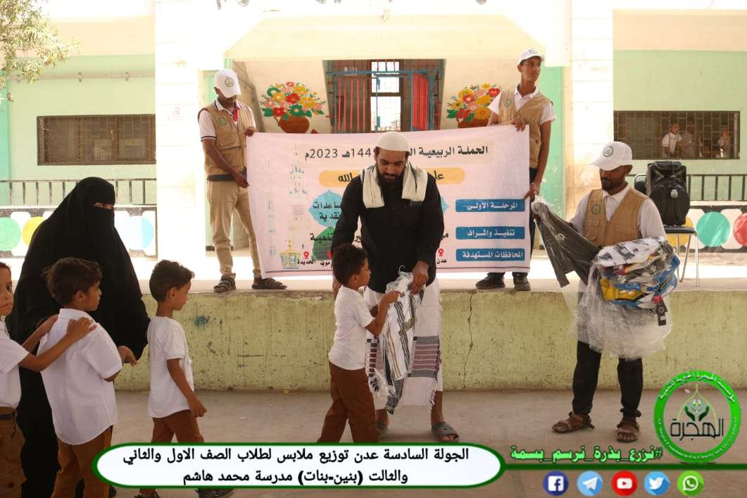 واصلت مؤسسة الهجرة الخيرية للتنمية بالعاصمة عدن ، جهودها الرامية للوصول إلى الأيتام وطلاب المدارس ، ضمن أعمال الحملة الربيعية "على نهجك يارسول الله" في عامها العاشر على التوالي من هذا العام 1445هـ - 2023م . وفي سادس تلك النزولات قامت المؤسسة يوم الأحد تاريخ ٢٥ صفر ١٤٤٥هـ الموافق 10 سبتمبر 2023م بتوزيع 53 حقيبة مدرسية لفئة الأيتام عبر مندوبي المناطق بالعاصمة عدن . كما قامت المؤسسة باستهداف طلاب وطالبات مدرسة محمد هاشم بالمنصورة ، حيث تم توزيع 97 حقيبة مدرسية مع مستلزماتها من الأدوات المدرسية والقرطاسية لطلاب وطالبات الصف الأول إلى الصف الخامس ، كما تم توزيع 400 بدلة رياضية لطلاب وطالبات الصف الأول والثاني والثالث ابتدائي . وقد استهدفت المؤسسة الطلاب النموذجيين وأبناء الأسر الفقيرة والمتعففة ، وذلك بالتنسيق مع إدارة مدرسة محمد هاشم والتي بدورها قامت بترتيب الطلاب ورصد الكشوفات وتسهيل عملية التوزيع . ويعد مشروع الحقيبة المدرسية أحد اهتمامات مؤسسة الهجرة ، لأنه يساهم في الحد من معاناة الطلاب ، خصوصاً الذين بدأوا بالذهاب إلى المدرسة في مراحلهم الأولى وكلهم أمل بالاستمرار في دراستهم نظراً للوضع المادي الصعب لدى آبائهم . وبهذا تشكر مؤسسة الهجرة مديرة مدرسة محمد هاشم الأستاذة القديرة سوسن الخضر على حسن الإستقبال وتسهيل عملية التوزيع بالمدرسة .