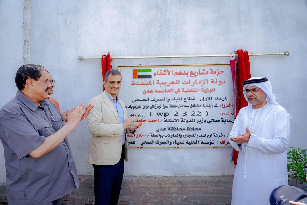 لملس والزعابي يفتتحان المرحلة الأولى من مشاريع تأهيل البنية التحتية لمؤسسة مياه عدن ومركز شرطة البريقة.