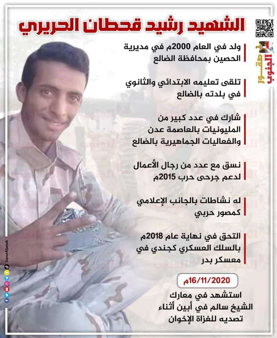 وفي الليلة الظلماء يفتقد البدر سيذكرني قومي اذا جد جدهم، شهيدنا البطل رشيد قحطان الحريري، يا حدثًا عظيمًا اعبر عنه في ذكرى استشهادك السنوية الرابعة، واعبر بهذي الكلمات البسيطة عن ما في فؤادي يوم ارتقت روحك الشابة الطاهرة وهي في ربيع ايامها شهيدآ للسماء حاملةً معها أوجاع أمٍ ثكلى رحلت عنا هي الاخرى ، وأب انتظر مهجة روحه لسنوات طوال. أخي كبلوني وغل لساني، واتهموني بأني تعاليت في عفتي، ووزعت روحي على تربتي ،فتخنق أنفاسهم قبضتي لأني أقدس حريتي لذا كبلوني.!ابيات مقتبسه. اخي يا اخي.! انه البطل القائد الشهيد رشيد قحطان لقد علمتنا و ارشدتنا ان الشهادة قيادة بسفك دمك الطاهر وانت تتصدى للعدو مدافعا عن تراب ارضك وعن عاصمتنا عدن في مشارفها وفي ذكرى استشهادك السنوية الرابعة اعبر عن ما في نفسي لعلي اريح عن ما بداخلها وفارقتني يا طعنة في خاصرتي، وذاب قلبي من بعدك عني وروحي باتت هائمةً تحكي لوعة الأيام وذكريات السنين انا لله وانا اليه راجعون ما نقول ال دع المقادير تجري كما يشاء الله والحمد لله دائما وابدا. ابكي يا سماء فمن كان سندي في الحياة ذهب إلى ربه شهيدًا وتركني أتجرع لوعة الألم لفراقه. وتركتني وترك اخوانه وابوك في ظلمة الدنيا وحيدًا. كم يوجعنا فراقك اخي حين ارتقت روحك شهيدًا في مثل هذا اليوم 16 من نوفمبر 2020 انه يومآ موجع وأليم ومحزن منذو رحلت عنا نحو السماوات العلا فمن لي سواك يُطمئن روحي الثكلى ويرفع عنا حزن السنين. يا من كنت فارقتنا شهيدًا دون أن تقول لنا كلمة وداع فيا رب صبرنا على فراقه. ربي ها أنت في سمائك العلا تجبر قلوب الحزانى فاجبر قلوبنا لفراق اخي الشهيد رشيد فليس سواكَ يا الله يسمع شكواي ويرحم قلوبنا. الذي ارتقى شهيدًا عند مليك رحيم. ولا اعتراض على حكمك يا رب وقدرك. الحمد لله على كل حال. ف هذي هي سنة الحياة والتضحيات للوطن هي وأجبة و غالية، وما يوجع قلوبنا اليوم هوا ما نحن فيه، من شقئ وعنا وما الحال الذي حل بجنوبنا الحبيب وشعبه ! من مؤامرات كيدية مجحفة ضالمة الى ان ذلك قدرنا، (من أجل (الجنوب) لكل الجنوبيين الشرفاء الأحرار ولا يمكننا التخلي عنه وكما قالها القائد الرئيس عيدروس قاسم عبدالعزيز الزُبيدي حفظه الله وسدد خطاه الى ما فية خير شعبنا الجنوب والأمة. قال اننا على درب شهداء الجنوب سأروون حتى النصر واستعادة دولة الجنوب وعاصمتها عدن. و دائمآ الحق منتصر وذلك هوا ايماننا الراسخ في قلوب شعب الجنوب الشرفاء. صابرون على الغلا والقهر مثل سفينة الصحراء ومن اجل الجنوب العربي تهون التضحية، ويسقط العملاء والجبناء والخونة والمرتزقة والمعتالين اليوم مناصبآ مزيفة من اجل مصلحه. دون اي وجة حق و على حساب دماء شهداءنا ومناضلينا، ولكن هيهات ان للصبر حدود وشعبنا في الجنوب سينتصر مهما الزيف والخداع اعتلا وسينتصر الجنوب بقيادة قائدنا ابو القاسم مع شعبه الأحرار الشرفاء على الاعداء وكل الزيف الزيف. ويبنى الوطن الجنوب وعاصمة عدن. رحم الله الشهيد القائد رشيد قحطان الحريري وشهداء الجنوب العربي جميعآ واسكنهم فسيح جناته!