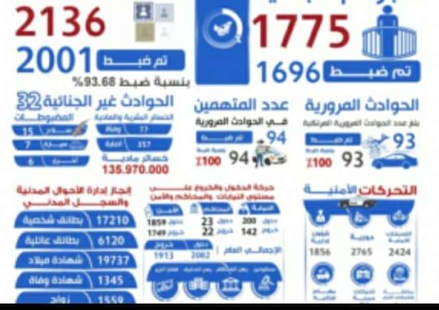 بذلت الأجهزة الأمنية بمحافظة الضالع في مختلف هيئاتها و وحداتها ومؤسساتها خلال العام المنصرم 2023م جهود جبارة في سبيل استتباب الأمن والاستقرار في المحافظة في عاصمة المحافظة والمديريات من خلال التنسيق المستمر من قبل العميد/ احمد قايد القبة مدير عام شرطة محافظة الضالع قائد الحزام الأمني مع السلطة المحلية والمجلس الانتقالي والسلطة القضائية والوحدات العسكرية والشخصيات الاجتماعية والمشائخ والأعيان ورجال المقاومة. لقد حققت الأجهزة الأمنية خلال عام 2023م نجاحات ملموسة للوقاية من الجريمة ومكافحتها وضبط مرتكبيها في ظل انعدام الإمكانيات المادية والنفقات التشغيلية وبالرغم من كل المعوقات والصعوبات و العراقيل والعقبات التي واجهت الأجهزة الأمنية في المحافظة إلا أن النجاحات كبيرة تحققت في الجانب الأمني، إذ تبرز ملامح التحسن الأمني من خلال نسبة ضبط الجريمة وأهم الإنجازات التي تحققت خلال العام 2023م كانت في الجوانب التالية: 1.بلغ عدد الجرائم الجنائية المرتكبة (1775) جريمة تم ضبط عدد(1696) جريمة بنسبة ضبط (95,55%) , وبلغ عدد المتهمين في هذه الجرائم (2136) متهم تم ضبط عدد(2001) متهم بنسبة ضبط (93,68%).. وقد كانت نتائج التصرف في الجرائم المضبوطة على النحو الاتي :- تم احالة (282) قضية الى النيابة و(54) قضية رهن التحقيق و(275) قضية الى جهات اخرى و(1023) قضية انتهت بالصلح و(62) قضية وقف إجراءات. 2.كان لإدارة البحث الجنائي في المحافظة النصيب الاكبر في استقبال البلاغات الجنائية حيث تلقت (269) بلاغ تم ضبط (245) بلاغ بنسبة ضبط (91%). 3.بلغت عدد الحوادث المرورية (93)حادثة تم ضبطها بشكل كامل واتخاذ الإجراءات القانونية حيالها , وفي جانب البلاغات غير الجنائية فقد رصدت شرطة الضالع (32)حادثة. 4.بلغ إجمالي الخسائر البشرية في الجرائم الجنائية والحوادث عدد (77) حالة وفاة و(357) حالة اصابة ,وبلغ اجمالي الخسائر المادية (135,970,000)ريال. 5.بلغت قضايا القتل العمد خلال العام 2023م (23) قضية تم ضبط (19) قضية بنسبة ضبط (82.61%) . 6.جرت المتابعة والتوجيه واتخاذ المعالجات والإجراءات في القضايا الجنائية الجسيمة ومتابعة كشف المجهول منها , حيث تم كشف (17) قضية من أصل (160) قضية مدورة من العام 2022م وما قبله, كما تم ضبط عدد( 28)قضية قيد التحري من أصل (178) قضية قيد التحري من العام 2022م وما قبله، وتم التركيز على متابعة المطلوبين أمنياً والفارين من وجه العدالة من العام 2022م وما قبله البالغين (208) مطلوب وفار من وجه العدالة تم ضبط منهم (55) متهم, كما تم ضبط عدد(12) متهم مطلوبين الى محافظات اخرى. 7.تم تكثيف الجهود لكشف الجرائم المجهولة وضبطها حيث بلغت نسبة زيادة الضبط عن العام السابق (25 %). 8.بلغ عدد السجناء في الاصلاحية المركزية والمتهمين في قضايا جسيمة عدد (315)سجين أغلبهم متهمين بقضايا قتل بنسبة (60%). 9.تم تنفيذ حملات أمنية من قوة طوارئ الحزام الأمني في متابعة أصحاب المحلات التجارية لتركيب الكاميرات امام محلاتهم’ وقد تم تركيب كاميرات لعدد (610)محل تجاري من اصل (720) محل تجاري في مدينة الضالع , ولا زالت اجراءات المتابعة مستمرة لاستكمال تركيب بقية المحلات في شوارع وأسواق المحافظة. 10.وفي جانب تعزيز الاجراءات الامنية وتنفيذ المهام والتحركات الامنية تم تنفيذ عدد(2424)تحرك أمني و(366) مرافقة امنية و(78) حملة امنية وعدد (2765) دورية في عاصمة المحافظة والمديريات و(1009) مهمة قتالية. 11.تعزيز التنسيق والتعاون بين الأجهزة الأمنية والعسكرية في المحافظة وكذا مع أجهزة النيابة والقضاء والسلطة المحلية والذي أنعكس إيجاباً في انجاز المهام الأمنية وفي تكامل ووحدة وسلامة الإجراءات، حيث بلغ اجتماعات اللجنة الأمنية بالمحافظة عدد (18) اجتماع، وعقد (15) اجتماع مع النيابة و(20) اجتماع مع المحاكم، وتم عقد (13) اجتماع مع الانتقالي وكذا عقد (8) اجتماعات مع المجلس المحلي والمكاتب الحكومية والأجهزة التنفيذية. 12.تجسيد دور الرقابة والتفتيش ولجنة المتابعة والتقييم من خلال النزول الميداني الى فروع الإدارات الأمنية والمديريات حيث بلغت عدد الن