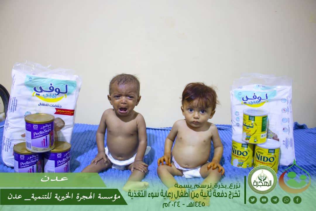 بتمويل عدد من فاعلي الخير، ترعى مؤسسة الهجرة الخيرية للتنمية برنامج تغذية للأطفال المصابين بسوء التغذية بمديرية المنصورة بالعاصمة عدن وتعالج كل عام مجموعة من الأطفال المصابين بسوء التغذية الحاد داخل مركز الهجرة الصحي الخيري التابع لها ، وبعد تخريج وتعافي الدفعة الأولى من الأطفال المصابين بسوء التغذية في العام السابق ، قامت مؤسسة الهجرة الخيرية للتنمية يوم الأربعاء الموافق 3 يناير 2024م ، بتخريج الدفعة الثانية من الأطفال المصابين بسوء التغذية بعد تعافيهم وتماثلهم بالشفاء . وتقوم مؤسسة الهجرة بتقديم الأغذية لهؤلاء الأطفال وتساعد عائلاتهم على رعايتهم والإهتمام بهم والعمل على توسيع نطاق الكشف المُبكر عن سوء التغذية لدى الأطفال وعلاجه من خلال توفير الأغذية العلاجية الجاهزة للاستخدام والتي تمتاز بكفاءه عالية في معالجة سوء التغذية الحاد الوخيم لدى الأطفال لاحتواءها على عناصر غذائية متوازنة . وتعمل مؤسسة الهجرة من خلال المركز الصحي الخيري التابع لها باستقطاب مجموعة من الأمهات المصابين أبنائهم بسوء التغذية وترتيب سكن لهن ولأولادهم بحيث يقوم أطباء المركز الصحي بالإهتمام بهم من خلال قياس أوزانهم ومراقبة نموهم وتقديم الدعم اللازم لهم ومتابعتهم حتى يتعافوا .