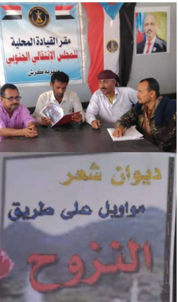 بحضور واشراف الاستاذ هارون الصمه رئيس انتقالي مديرية كرش تسلم صباح اليوم الاستاذ غفير السويدي مدير الادارة الثقافية بالهيئة التنفيذية ديوان شعر شعبي لمؤلفه الاستاذ طه الدلي مدير تنظيمية الهيئة التنفيذية. الديوان بعنوان "مواويل على طريق النزوح) ويحوي خمسون قصيدة شعرية باللهجة العامية تطرق فيها الشاعر حول معانات النزوح ومفارقة الديار وحالة الفقر والحرمان. وأشار الدلي ان مجمل قصائده الشعرية الشعبية تمحورت حول النزوح ومعاناته منذ بداية الحرب التي شنتها مليشيات الحوثي على الأراضي الجنوبية طيلة تسعة سنوات عجاف اضطرت الشاعر مع كثير من المواطنيين لمغادرة بيوتهم وقراهم وفارقت بين الاخوان والأهل والاحباب، شاكرا في الوقت نفسه رئيس الهيئة التنفيذية ومدير الادارة الثقافية على تشجيعهم لطرح الديوان والعمل على طباعته والعمل على نشره بالتنسيق مع ثقافية انتقالي المحافظة. من جانبه وجه الاستاذ الصمه الادارة الثقافية الى الإهتمام بالمواهب في شتاء المناحي والإتجاهات الأدبية والفكرية والإبتكارات العلمية ورفعها للإدارة الثقافية لإنتقالي المحافظة لعمل ما يلزم. حضر اللقاء نائب مدير الإدارة القانونية بالهيئة التنفيذية محمد سعيد عبادي