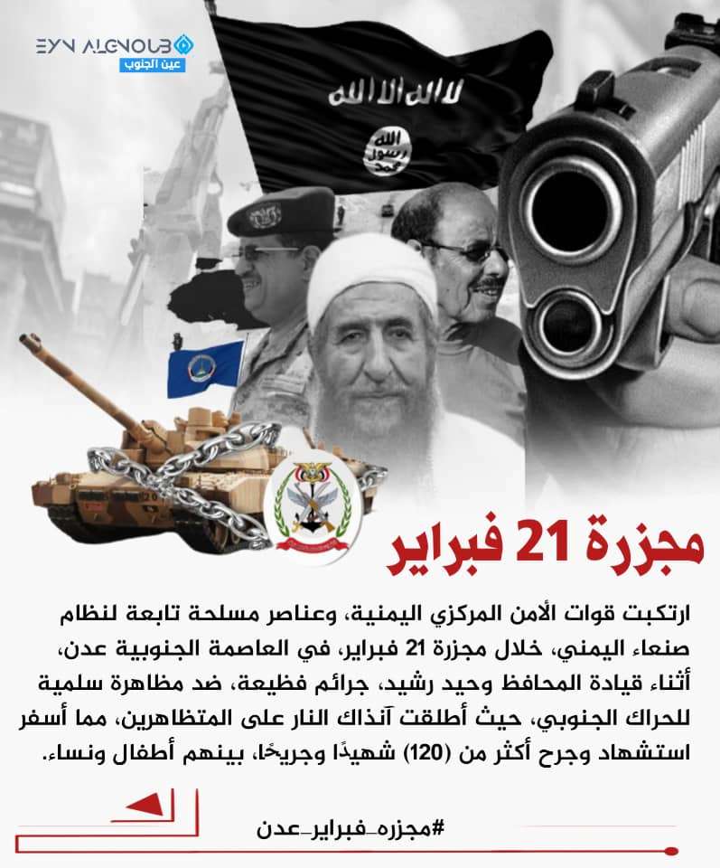 اشعل سياسيون جنوبيون مواقع التواصل الاجتماعي، وفي مقدمتها منصة (أكس)، (تويتر) سابقًا، بوسم #مجزره_فبراير_عدن . وتزامن الهاشتاج مع حلول الذكرى الحادية عشرة لمجزرة 21 فبراير، والتي تُصادف يوم الأربعاء 21 فبراير 2024م، والتي ارتكبت خلالها قوى صنعاء اليمنية وعصاباتها، مجزرة مروعة ضد أبناء الجنوب في العاصمة الجنوبية عدن، خلال عام 2013م. وأكد السياسيون الجنوبيون على أن مجازر قوى صنعاء اليمنية وعصاباتها، واتباعها، التي ارتكبتها ضد أبناء شعب الجنوب، لن تمر مرور الكرام، ولن ينساها شعب الجنوب، وستظل وصمة عار في جبين ما تُسمى بـ(الوحدة اليمنية)، المشؤومة. كما أكدوا على ذكرى مجزرة 21 فبراير، حكت عن صمود شعب جنوبي عظيم، وإرادة وطن غالي. وذكروا بأن خلال شهر فبراير حدثت مجزرتين ضد شعب الجنوب من قبل قوى صنعاء اليمنية الإرهابية، حيث كانت المجزرة الأولى في 21 فبراير 2013م، فيما كانت الثانية في 21 فبراير 2014م. وأشاروا إلى أن شعب الجنوب أصبح اليوم يمتلك قوات مُسلحة صلبة، وممثل سياسي، قادران على حماية شعبهما، من أي اعتداءات أو ممارسات همجية تحاول قوى صنعاء اليمنية الإرهابية بشقيها (الحوثي الإخواني) فعلها ضد أبناء الجنوب. ونوهوا بأن كافة جرائم قوى صنعاء اليمنية ضد الجنوب وشعبه، لن تسقط بالتقادم، وأن كل قطرة دم جنوبية ازهقتها قوات الاحتلال اليمني، لن يكون ثمنها إلا دولة جنوبية كاملة السيادة، وهذا عهد قطعه كل جنوبي وجنوبية على نفسه، ولا تراجع عنه مهما كان الثمن باهظًا. وعصر اليوم الثلاثاء 20 فبراير / شباط 2024م، اطلق ناشطون وسياسيون جنوبيون، هاشتاج #مجزره_فبراير_عدن على مواقع التواصل الاجتماعي، اشهرها منصة X)). وقالوا بأن: "هدف قوى الاحتلال اليمني خلال مجزرة 21 فبراير 2013م آنذاك، كان قمع مليونية (الكرامة الجنوبية)، التي اُقيمت في ساحة الحرية والشهداء بمديرية خور مكسر في العاصمة الجنوبية عدن، والتي اُستشهد وجُرح خلالها أكثر من (120) شهيدًا وجريحًا، بينهم أطفال ونساء". وأضافوا: "مجزرة 21 فبراير 2013م، تعتبر واحدة من أشكال متنوعة من الانتهاكات والمجازر والقتل واراقة الدم ضد شعب الجنوب، من قبل قوى الاحتلال اليمني. وجددوا التأكيد على أن قوى الاحتلال اليمني، كانت تُمارس الإبادة الجماعية ضد شعب الجنوب السلمي، موضحين بأن خلال ارتكاب قوى صنعاء اليمنية الإرهابية بشقيها (الحوثي الإخواني)، مجزرة 21 فبراير، في العاصمة الجنوبية عدن، ضد شعب الجنوب، كانت خلال فترة تولي وحيد رشيد، قيادة عدن كمحافظ. ودعوا إلى أهمية الالتفاف حول المجلس الانتقالي الجنوبي بقيادة الرئيس القائد عيدروس بن قاسم الزُبيدي، حتى استعادة وبناء دولة الجنوب كاملة السيادة، مؤكدين على أهمية الثبات على الأرض والتمسك بحق شعب الجنوب في تقرير مصيره دون أي وصاية، وتأكيد بأن سر انتصارات الجنوب تكمن في تلاحمه، وقوة صفه، مُشيرين إلى أن أقدام شعب الجنوب على أرضه، كانت، وما زالت ثابتة، وقضيته الجنوبية العادلة محمية بإرادته الشعبية العظيمة، وبسواعد أبطال القوات المُسلحة الجنوبية، وبحنكة قيادته ممثلة بالسيد الرئيس القائد عيدروس بن قاسم الزُبيدي. وأوضحوا بأن: "المفارقة بين مجزرة 21 فبراير ضد شعب الجنوب في العاصمة الجنوبية عدن، وبين تظاهرات اتباع حزب الإصلاح الإرهابي، في العاصمة اليمنية صنعاء، هو في ارتكاب قوات الاحتلال اليمني في الأولى (مجزرة 21 فبراير)، مجزرة فظيعة ضد شعب الجنوب بالعاصمة عدن، فيما لم تعترض قوات الاحتلال في الثانية (تظاهرات اتباع حزب الإصلاح)، المتظاهرون بالعاصمة اليمنية صنعاء، وتركتهم يتظاهرون كيفما أرادوا، في حين قتلت عشرات من أبناء الجنوب في ذات الوقت خلال تظاهرهم السلمي في ساحة الحرية والشهداء بالعاصمة الجنوبية عدن". وأكدوا على أن: "الجنوب اقترب من الخلاص والانعتاق من الاستعمار اليمني الغاشم، الذي ظل جاثمًا على أرض ودولة الجنوب منذ غزو سنة 1994م". ووجهوا دعوة لكافة أبناء شعب الجنوب الأبي، إلى إحياء الذكرى الحادية عشرة لمجزرة (21 فبر