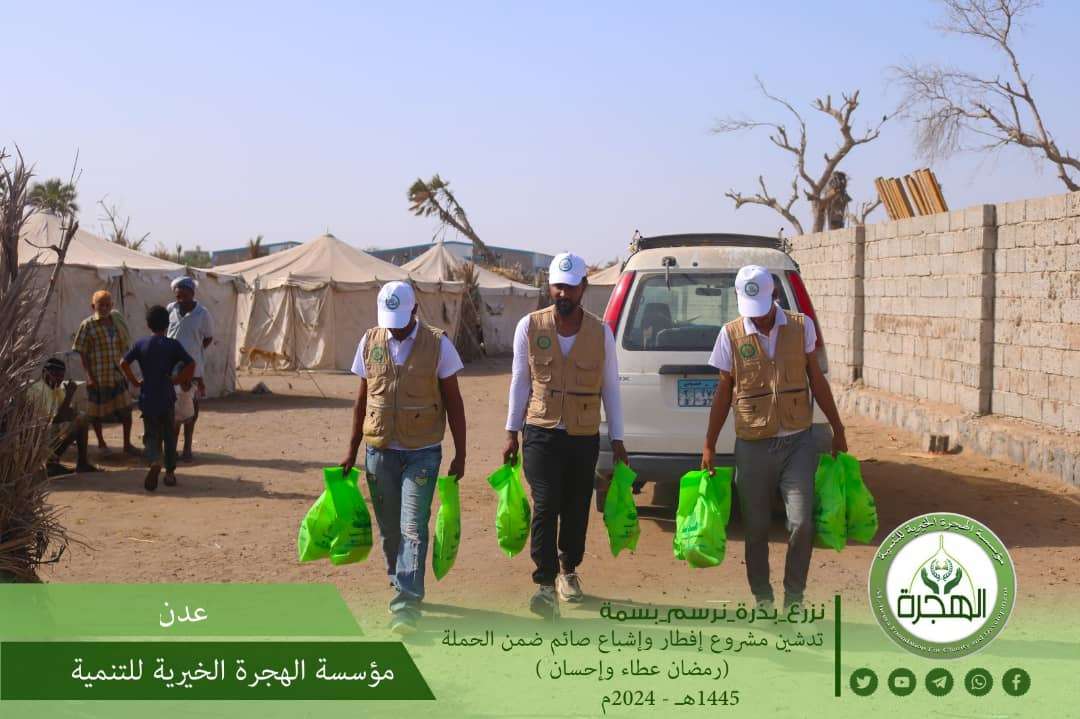 منذ أول أيام الشهر الكريم، وفي إطار حملتها الرمضانية العاشرة (رمضان عطاء وإحسان) ، من هذا العام ١٤٤٥هـ - 2024م، دشنت مؤسسة الهجرة الخيرية للتنمية بالعاصمة عدن مشروع إفطار وإشباع صائم الخيري لشهر رمضان الكريم، والذي يقدم يومياً اكثر من 500 وجبة إفطار محتوية على (التمر والماء والشربة والأرز والدجاج) بدعم وتمويل من فاعلي الخير . كما تجدر الإشارة إلى أن المشروع يضم أيضاً وجبة ( إشباع صائم ) حيث تحتوي الوجبة على ( تمر – ماء – وجبة عشاء [أرز مع الدجاج]) ويتم إيصالها إلى أماكن المستهدفين بعد التنسيق المسبق معهم عبر مندوبي المؤسسة في المناطق . حيث يشارك المؤسسة في توزيع تلك الوجبات الخيرية قرابة ثلاثين جهة منفذة مابين مؤسسة ومبادرة ومنتدى خيري تطوعي ومندوبي المناطق على مستوى جميع مديريات العاصمة عدن، حسب جدول منظم أعدته إدارة المؤسسة قبيل دخول الشهر الكريم، كما تستوعب المؤسسة في توزيع الوجبات المسجلين لديها من الأسر الفقيرة والمحتاجة. الجدير بالذكر أن المشروع يستمر طيلة أيام شهر رمضان بدعم وتمويل من فاعلي خير ويمكن المساهمة فيه للجميع .