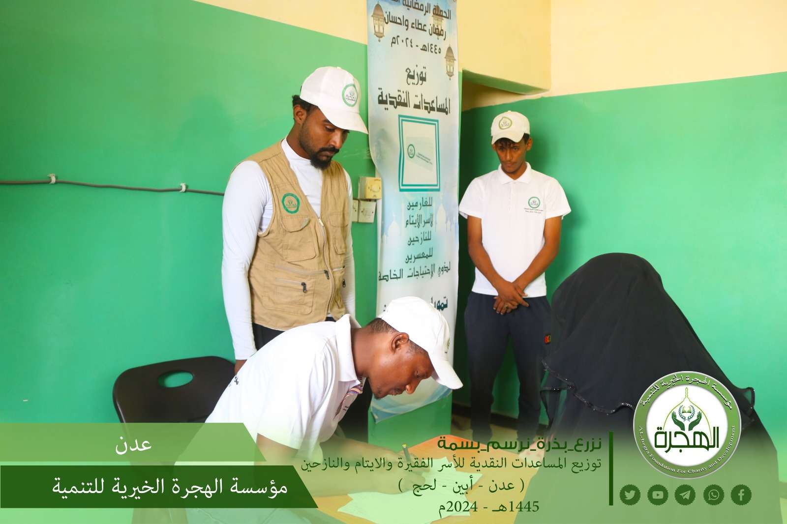 واصلت مؤسسة الهجرة الخيرية للتنمية أعمالها الرمضانية بتنفيذ مشروع المساعدات النقدية لمستحقيها والتي تنفذه كل عام بدعم وتمويل من فاعلي خير ، والذي يندرج ضمن أعمال الحملة الرمضانية العاشرة (رمضان عطاء وإحسان) من هذا العام ١٤٤٥هـ - 2024م. حيث شملت المساعدات توزيع أكثر من 200 ظرف نقدي، تم من خلاله استهداف مجموعة من الفقراء والمحتاجين ممن يعانون من الأمراض المزمنة والمعاقين، ومساعدة الأيتام والنازحين وبيوت الأسر المتعففة والفقيرة في عدد من المناطق بمحافظات عدن ولحج وأبين. وتتواصل أعمال الحملة الرمضانية العاشرة لمؤسسة الهجرة حتى أواخر الشهر الكريم، بتنفيذ بقية الأعمال الخيرية والإنسانية للحملة.