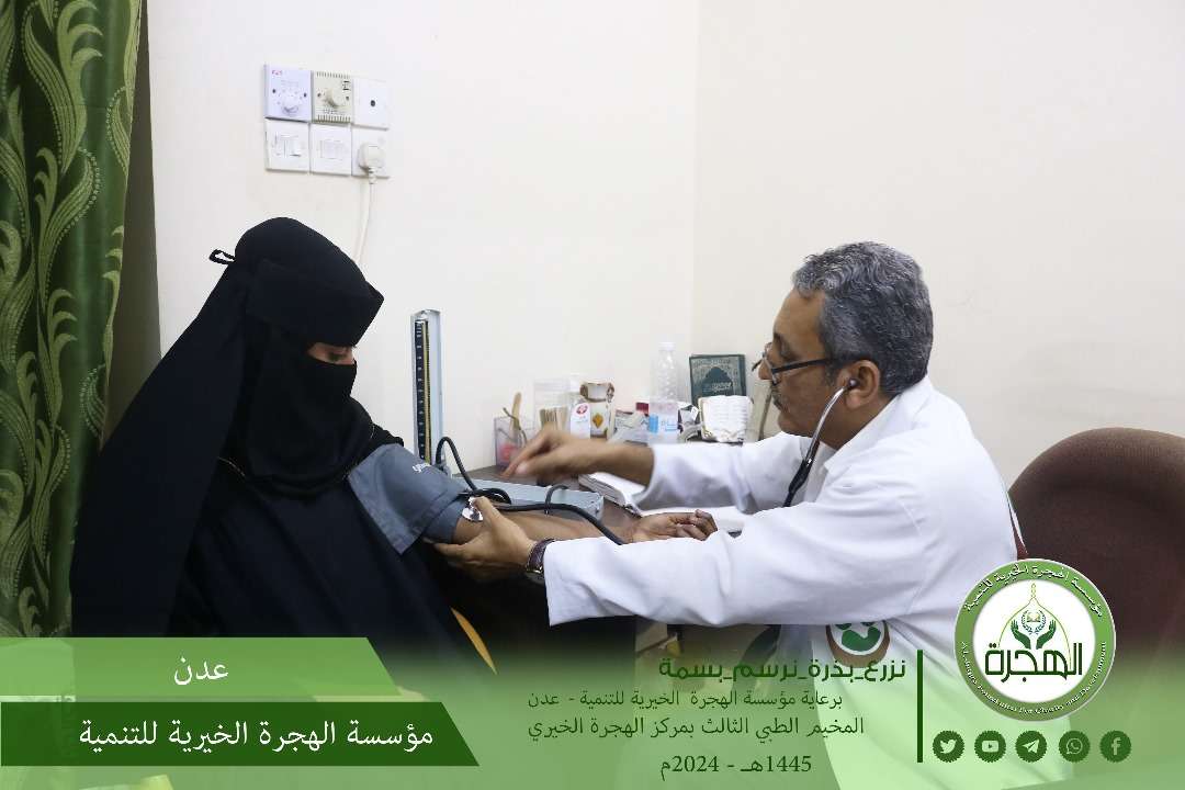 تحت رعاية وإشراف مؤسسة الهجرة الخيرية للتنمية، وضمن أعمال الحملة الرمضانية العاشرة (رمضان عطاء وإحسان) أقام مركز الهجرة الطبي الخيري في مديرية المنصورة بالعاصمة عدن - المخيم الطبي الخيري الرمضاني الثالث للعلاج داخل المركز ولمدة ثلاثة أيام متوالية ابتداء من يوم الأحد ٢١ إلى ٢٣ رمضان ١٤٤٥هـ الموافق 31 مارس إلى 2 أبريل 2024م، بمناسبة شهر رمضان الفضيل، استفاد منه قرابة 113 مريضاً من الرجال والنساء والأطفال ، وذلك بدخول المرضى للدكاترة بالمركز للمعاينة مجاناً، وخصوماتٍ بلغت أكثر من 50% في جميع الفحوصات الطبية والأدوية الصيدلانية، وخصومات 30% لجهاز الموجات فوق الصوتية. حيث شارك أغلبية الدكاترة المختصين والممرضات في هذا اليوم الطبي بما فيهم اخصائية النساء والولادة والأطفال والطبيب العام وقسم تطعيم الأطفال . الجدير بالذكر أن مركز الهجرة الطبي الخيري التابع لمؤسسة الهجرة يواصل تقديم خدماته الطبية الخيرية برسوم مخفضة عن بقية المراكز والمستشفيات الأخرى، وذلك من يوم السبت إلى الخميس من كل أسبوع ، ويستقبل المرضى من جميع الفئات المختلفة (الرجال، النساء، الأطفال)، تحت إشراف دكاترة مختصين بأقسام (الأطفال ونساء وولادة وباطنية و الأسنان وطب عام)، وممرضات مختصات في مجالاتهم الطبية المختلفة بما في ذلك قسم المجارحة والمختبر والصيدلية، كما يقدم المركز خدمات الصحه الإنجابية للنساء بصرف موانع الحمل والمشورة، والخدمة الكافية للأم الحامل، واكتشاف الأمراض عبر التشخيص والفحوصات الطبية مثل الضغط والسكر أومشاكل الحمل وتقديم المشورة والنصح في أمور الحمل، وتقديم الرعايه التكاملية للطفل، وعلاج الحالات وتقديم الإرشادات للأطفال والأمهات.