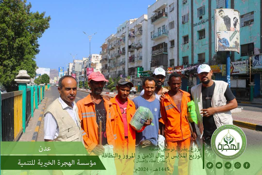 بالتنسيق مع الأستاذ قائد المفلحي رئيس السلم الأهلي بمديرية المنصورة ، نفذت مؤسسة الهجرة الخيرية للتنمية نزولاً شمل زيارة عدد كبير من النقاط الأمنية والمرور على شوارع العاصمة عدن ، ومجموعة من عمال النظافة ، حيث وزعت لهم ملابس عيدية ، إيماناً بدورهم الكبير في خدمة الناس ، وجبراً لخواطرهم وفرحة لهم ، وذلك ضمن الأعمال الخيرية للحملة الرمضانية العاشرة (رمضان عطاء وإحسان) لهذا العام ١٤٤٥هـ - 2024م . وقد بلغ عدد المستفيدين من هذه الملابس أكثر من 250 فرد . يأتي ذلك العمل تقليدًا سنويًا تهتم بتفيذه إدارة المؤسسة ضمن أعمال الحملة الرمضانية الخيرية من كل عام ، وذلك لتشمل أعمال الحملة جميع فئات المجتمع بمكوناته المختلفة.
