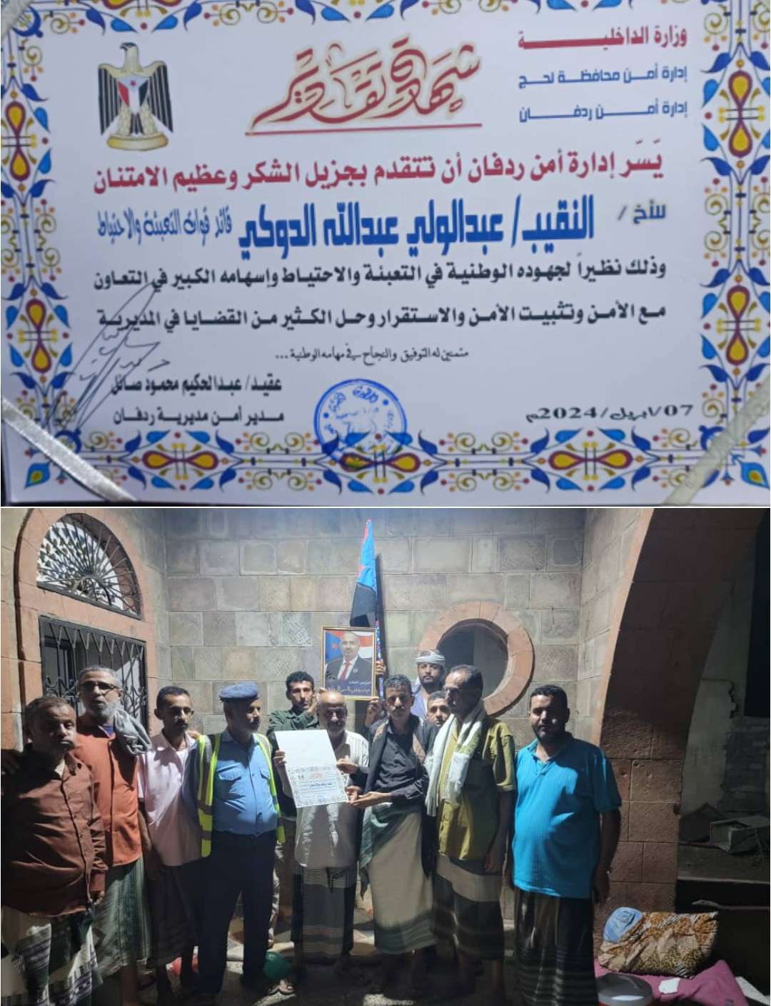 إدارة الأمن والبحث في ردفان تكرمان النقيب عبدالولي الدوكي بشهادة تقديرية