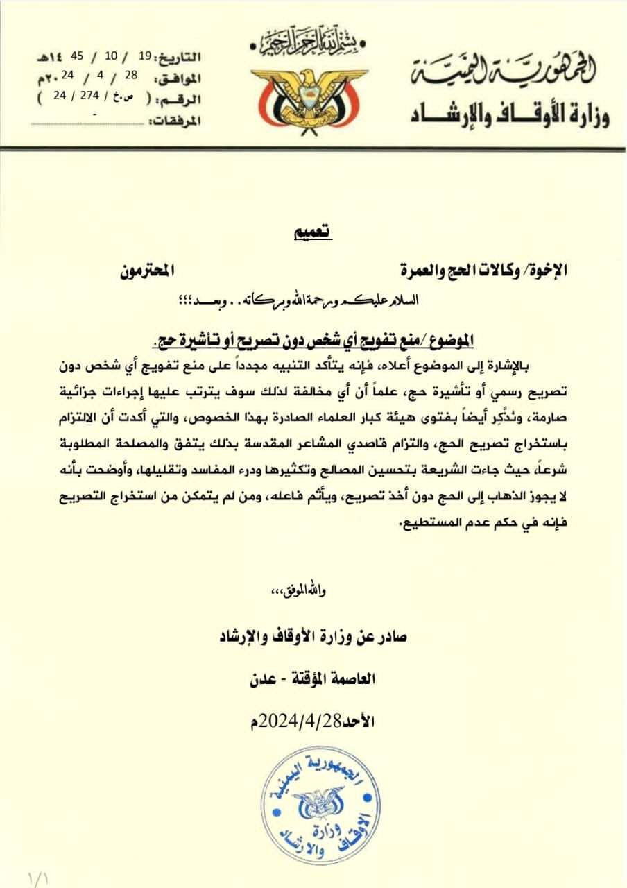 أكدت وزارة الأوقاف والإرشاد بالعاصمة الجنوبية عدن، اليوم، تحذيرها الشديد لوكالات الحج والعمرة، بمنع تفويج أي شخص لايحمل تأشيرة حج رسمية عبر منشآت الحج المعتمدة لدى قطاع الحج والعمرة بالوزارة للموسم الحالي 1445هجرية. وأوضحت الوزارة أنها ستتخذ الإجراءات القانونية الصارمة تجاه أي منشأة أو مسؤول يتورط في ذلك، حتى لا يؤثر على حركة تفويج الحجاج ولا يتعدى على حقوقهم في مقاعد الباصات أو الأسِرة في مساكن الحجاج. كما حذرت الوزارة في تعميمها من إدخال أي شخص عبر وسائل النقل المحددة للحجاج اليمنيين إلى مكة المكرمة والمدينة المنورة والمشاعر المقدسة في منى وعرفات ومزدلفة بأي شكلٍ من الأشكال. وجددت الوزارة تحذيرها للمواطنين من أي تعامل مع جهات وهمية أو أشخاص أو حسابات أو روابط مضللة في مواقع التواصل الاجتماعي تهدف إلى نهب ممتلكاتهم وسرقة معلوماتهم والتعدي على خصوصياتهم. وأكدت أن خدمات الإعاشة والمخيمات والمساكن ووسائل النقل أجورٌ يجمع مقابلها الحاج طوال عمره ليتمكن من أداء مناسكه بسهولة ويسر، ومن الحرام شرعًا والممنوع قانونًا التعدي على حقوق الآخرين فكيف لو كان حاجًا؟! وأشارت الوزارة بهذا الخصوص إلى الفتوى الشرعية الصادرة عن هيئة كبار العلماء في المملكة العربية السعودية التي أكدت على أن الالتزام باستخراج تصريح حج، والتزام قاصدي المشاعر المقدسة بذلك يتفق والمصلحة المطلوبة شرعًا، حيث جاءت الشريعة بتحسين المصالح وتكثيرها ودرء المفاسد وتقليلها، وأوضحت أنه لايجوز الذهاب إلى الحج دون أخذ تصريح، ويأثم فاعله، ومن لم يتمكن من استخراج التصريح فإنه في حكم عدم المستطيع.