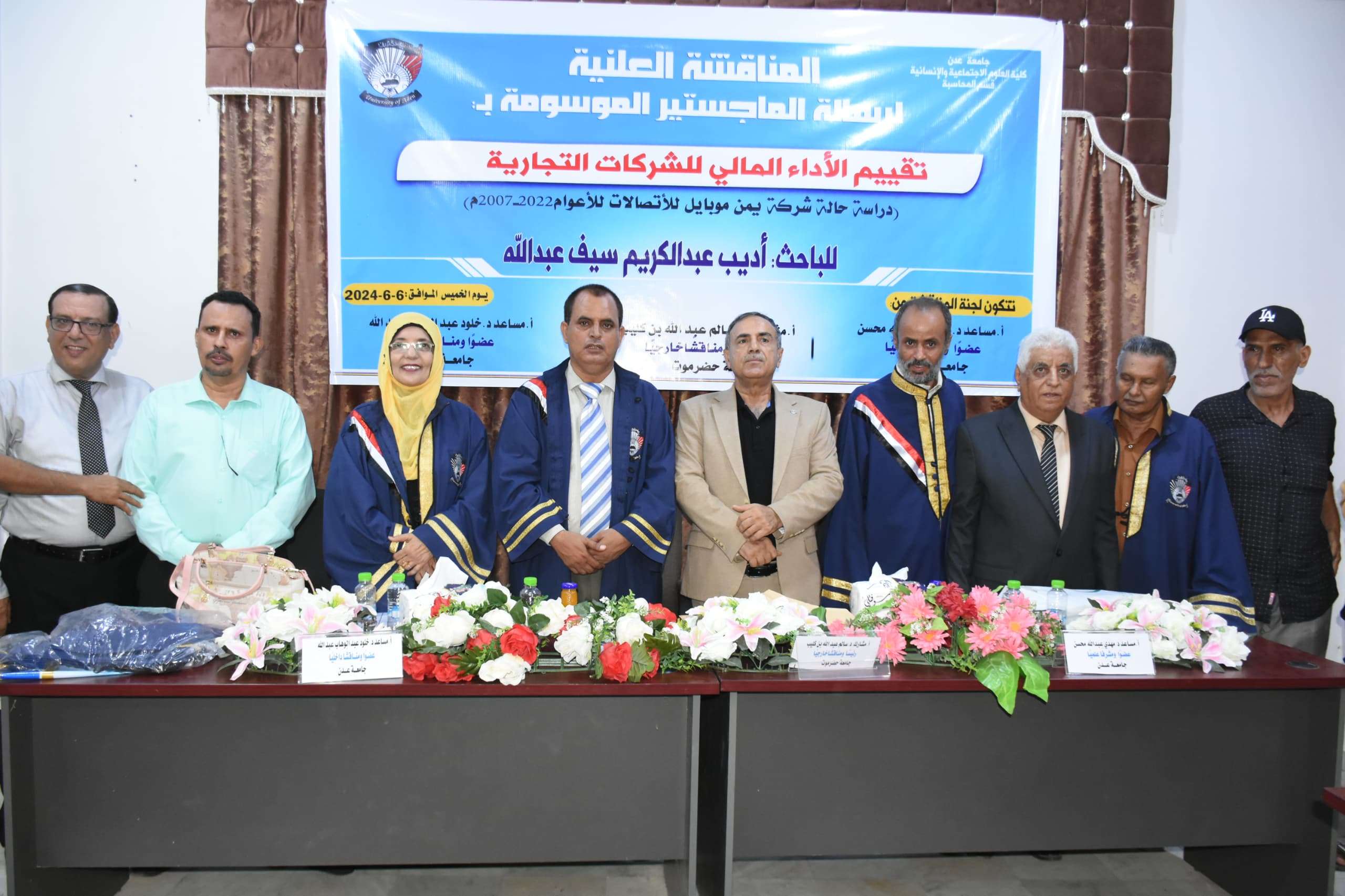 منحت كلية العلوم الإنسانية والتطبيقية بجامعة عدن اليوم الباحث/ أديب عبدالكريم سيف عبدالله درجة الماجستير في الإدارة عن رسالته الموسومة بـ " تقييم الأداء المالي للشركات التجارية - دراسة حالة شركة يمن موبايل للاتصالات للأعوام 2007-2022م". وفي مستهل المناقشة العلمية استعرض الباحث/ أديب عبدالكريم ملخصاً موجزاً لرسالته العلمية تطرق خلاله إلى المنهجية العلمية التي اتبعها في إعداد رسالته، وإلى بنيتها، مستعرضاً التوصيات والاستنتاجات التي خرجت بها الرسالة العلمية، بالإضافة إلى الصعوبات التي واجهها أثناء عملية البحث ودراسة الحالة. وقد أشادت لجنة المناقشة والحكم بالجهود الكبيرة التي بذلها الباحث في رسالته العلمية ونتائجها التي سيستفيد منها الباحثين والمؤسسات البحثية والمكتبات الجامعية اليمنية والعربية والشركات والمؤسسات ذات الصلة، التي تهدف إلى أهمية تقييم الأداء في الشركات التجارية لاكتشاف الانحرافات والتقييم المنتظم للأداء لتحقيق الأهداف المالية والإدارية، والتي تستدعي العمل بها وأخذها بعين الاعتبار من قبل شركات الاتصال المعنية. وتكونت لجنة المناقشة والحكم للرسالة العلمية من أ.مشارك.د/ سالم عبدالله بن كليب رئيس اللجنة مناقشاً خارجياً من جامعة حضرموت، وأ.مساعد.د/ خلود عبدالوهاب عبدالله عضو اللجنة مناقشاً داخلياً من جامعة عدن، وأ.مساعد.د/ مهدي عبدالله محسن عضو اللجنة مشرفاً علمياً من جامعة عدن. وشهدت المناقشة العلمية حضوراً متميزاً من قيادة جامعتي عدن ولحج يتقدمهم الأستاذ الدكتور/ الخضر ناصر لصور رئيس جامعة عدن، والأستاذ الدكتور/أحمد مهدي فضيل رئيس جامعة لحج، والأستاذ/عبدالرؤوف السقاف عضو المجلس الرئاسي للمجلس الانتقالي وكيل محافظة عدن لشؤون الشباب، والمهندس/نزار هيثم عضو المجلس الرئاسي للمجلس الانتقالي، وعددٍ من العمداء ومدراء العموم في جامعة عدن، وحشد كبير من زملاء وأصدقاء وأقارب الباحث، ولفيف من الأكاديميين والباحثين في جامعة عدن والشخصيات الاجتماعية وجمع غفير من الإعلاميين والطلاب. الجدير بالذكر أن الباحث/ أديب عبدالكريم سيف عبدالله يشغل حالياً الأمين العام المساعد بجامعة عدن، ويُعد من الكوادر الإدارية المتميزة بالجامعة، ومن الشخصيات التي تحظى باحترام واسع في الوسط الأكاديمي والإداري، وله العديد من الإنجازات والبصمات الإدارية المشهود لها على مستوى الجامعة.