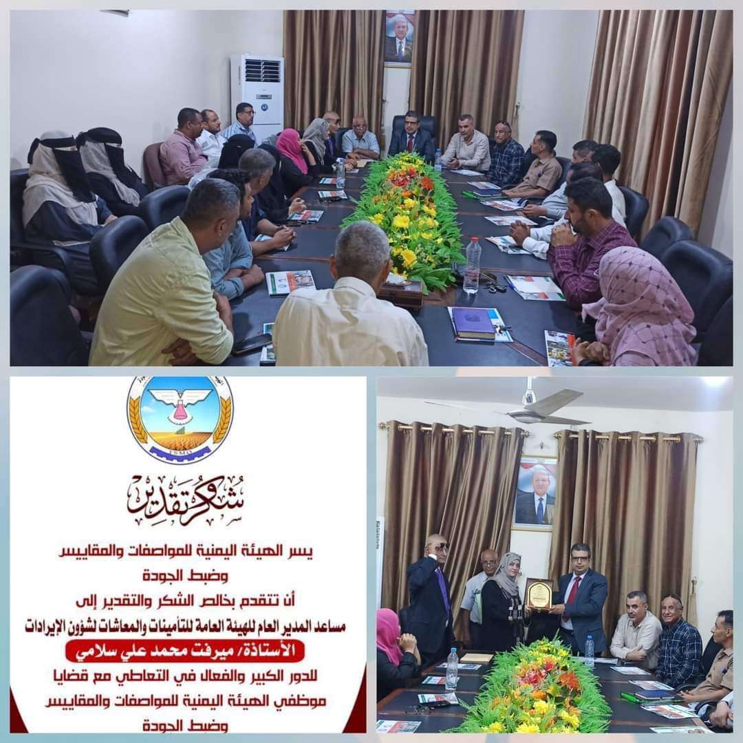كرمت الهيئة اليمنية للمواصفات والمقاييس وضبط الجودة اليوم الاحد الموافق 9 يونيو 2024م بالعاصمة الجنوبية عدن في ديوان عام الهيئة، مساعد المدير العام للهيئةالعامة للتأمينات والمعاشات لشؤون الإيرادات الأستاذة ميرفت محمد علي سلامي. ويأتي هذا التكريم نظرا لجهودها والدور الكبير الذي قامت به في التعاطي مع قضايا موظفي الهيئة وتسهيل المعاملات بين الهيئتين. وتم تسليم الدرع من قبل مدير عام هيئة المواصفات والمقاييس المهندس حديد الماس، في حضور نواب مدير عام الهيئة ومدراء الادارات ومجموعة من موظفي الهيئة و موظفي هيئة التأمينات والمعاشات. واعربت الاستاذة ميرفت سلامي خلال كلمتها للهيئة عن امتنانها لحصولها على درع التكريم، وتقديرها لالتزام هيئة المواصفات والمقاييس بالنظام وتسيير العمل وفق الأطر والانظمة القانونية. من جهتها تقدمت الهيئة بالشكر الجزيل لهيئة التأمينات والمعاشات على طريقتها المهنية في التعامل مع كافة الملفات والمعاملات الخاصة بالهيئة.