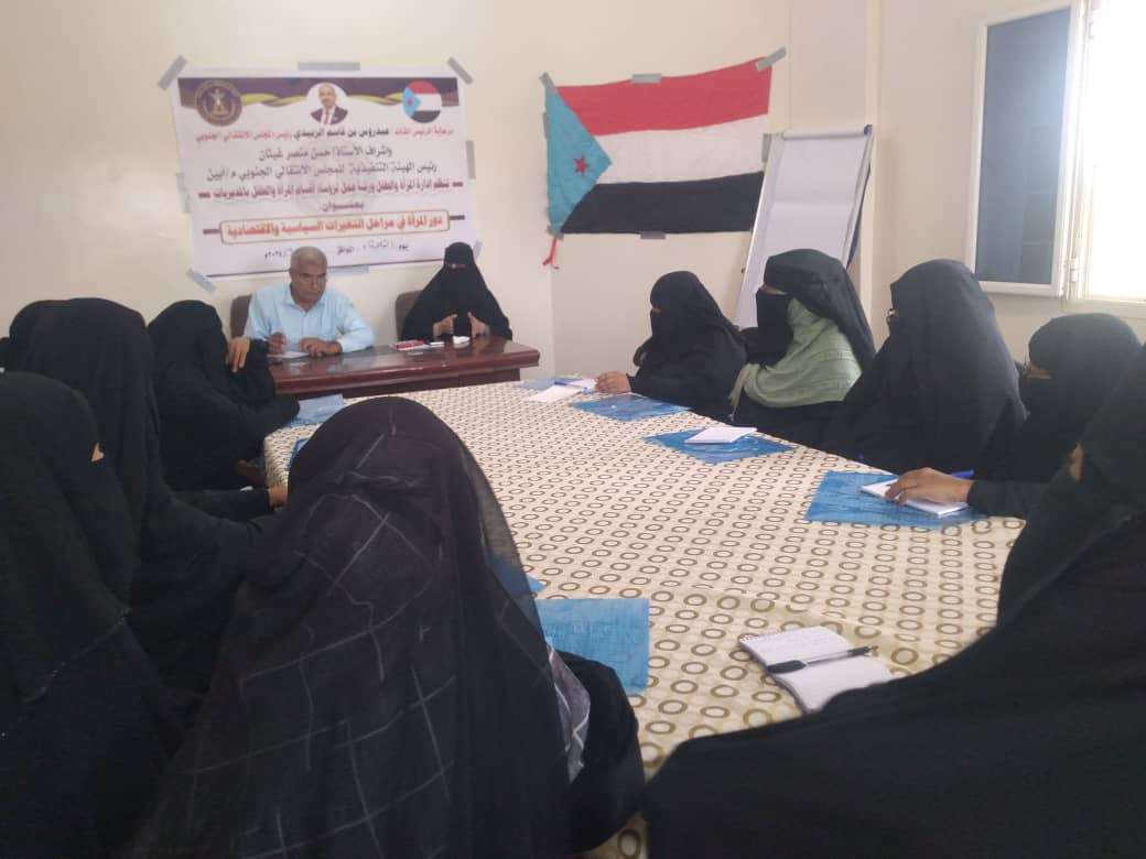 إدارة المرأة والطفل بانتقالي أبين تنظم ورشة عمل حول "دور المرأة في المتغيرات السياسية والاقتصادية"