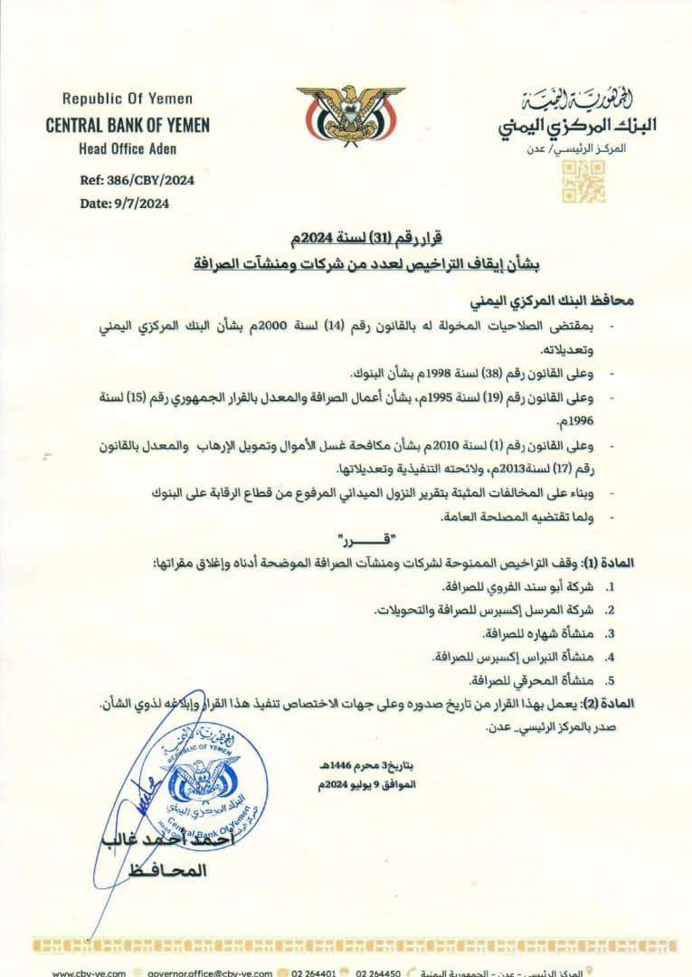 أصدر محافظ البنك المركزي اليمني أ. أحمد أحمد غالب قرار رقم (31) بشأن إيقاف تراخيص عدد من شركات ومنشآت الصرافة التالية: شركة أبو سند الفروي للصرافة. شركة المرسل إكسبرس للصرافة والتحويلات. منشأة شاهره للصرافة. منشأة النبراس إكسبرس للصرافة. منشأة المحرقي للصرافة. وذلك بناء على المخالفات المثبتة بتقرير النزول الميداني المرفوع من قطاع الرقابة على البنوك ولما تقتضيه المصلحة العامة.