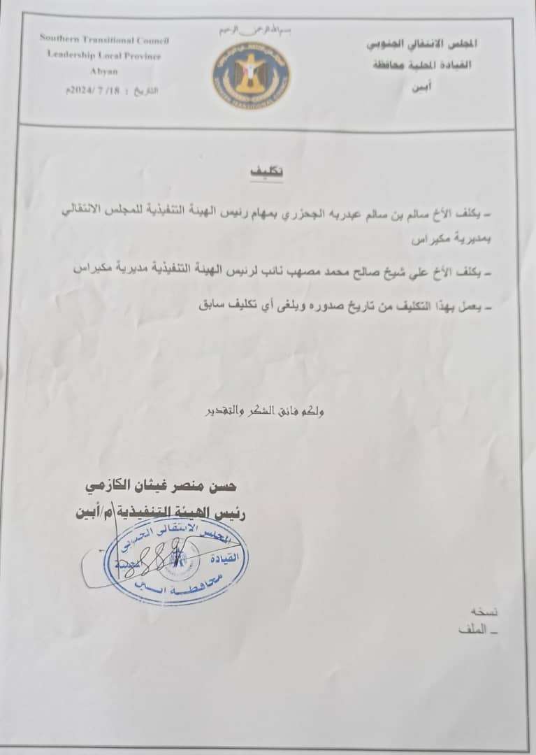 اصدر رئيس الهيئة التنفيذية للقيادة المحلية بالمجلس الانتقالي بمحافظة أبين الاستاذ حسن منصر غيثان الكازمي اليوم الخميس قرارا بتكليف رئيس ونائبا للهيئة التنفيذية بانتقالي مكيراس وقضت المادة الأولى من القرار بتكليف الأخ سالم بن سالم عبدربه الجحزري رئيساً للهيئة التنفيذية للقيادة المحلية بالمجلس الانتقالي بمديرية مكيراس وقضت المادة الثانية بتكليف علي شيخ محمد صالح مصهب نائباً لرئيس الهيئة التنفيذية بانتقالي مكيراس ويعمل بهذا التكليف من تاريخ صدوره ويلغى أي تكليف سابق.