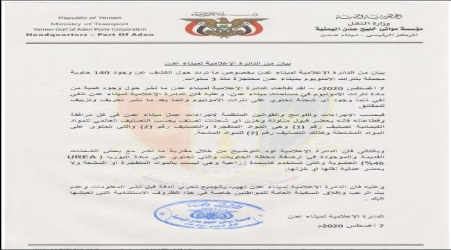 رسميا ميناء عدن ينفي وجود مادة الامونيوم