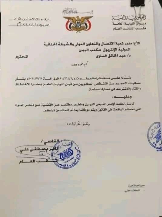 أصدر النائب العام للجمهورية، القاضي قاهر مصطفى، اليوم الأربعاء، أوامر قبض قهرية خارجية لملاحقة المتهمين بجريمة اختطاف المقدم علي عشال الجعدني، الذين يختبئون خارج البلاد. وجاء هذا القرار استجابة لمذكرة اللجنة الأمنية العليا بتاريخ 17 يوليو 2023، التي طالبت باتخاذ الإجراءات القانونية اللازمة لملاحقة المتهمين الهاربين والمتورطين في عمليات الاختطاف والقتل والاعتداء على ضباط عسكريين ومدنيين. وفي إطار تنفيذ هذه الأوامر، أرسل النائب العام مذكرة رسمية إلى مدير شعبة الاتصال والتعاون الدولي والشرطة الجنائية الدولية (الإنتربول) بمكتب اليمن، الدكتور عبد الخالق السعدي، تطالبه باتخاذ الإجراءات اللازمة وفق القانون الدولي لملاحقة المتهمين وضبطهم. ويأتي هذا القرار في سياق جهود السلطات الأمنية والقضائية لتعزيز الأمن والاستقرار ومحاسبة المسؤولين عن الجرائم التي تهدد أمن المواطنين وتعرقل سير العدالة.