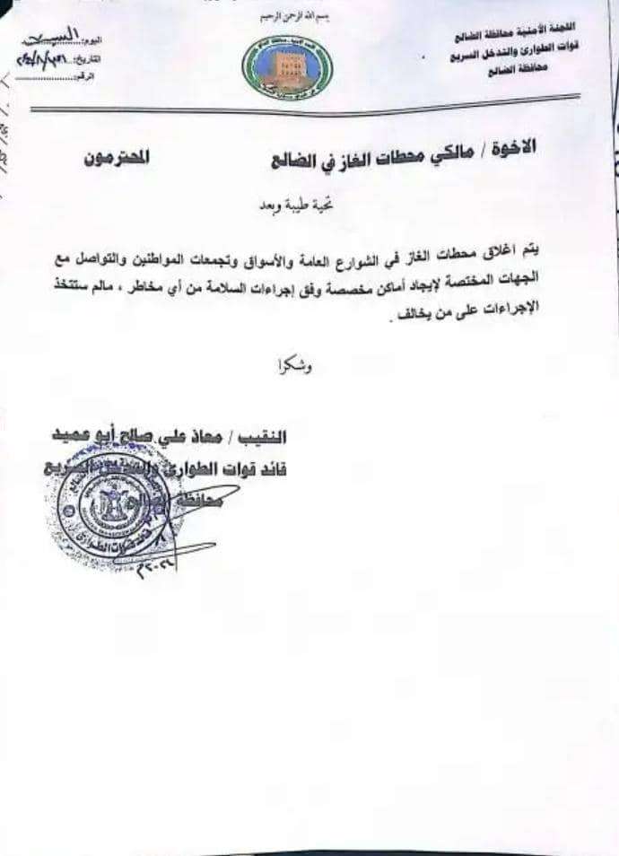 طوارئ اللجنة الأمنية بالضالع تصدر تعميم لمالكي محطات الغاز.