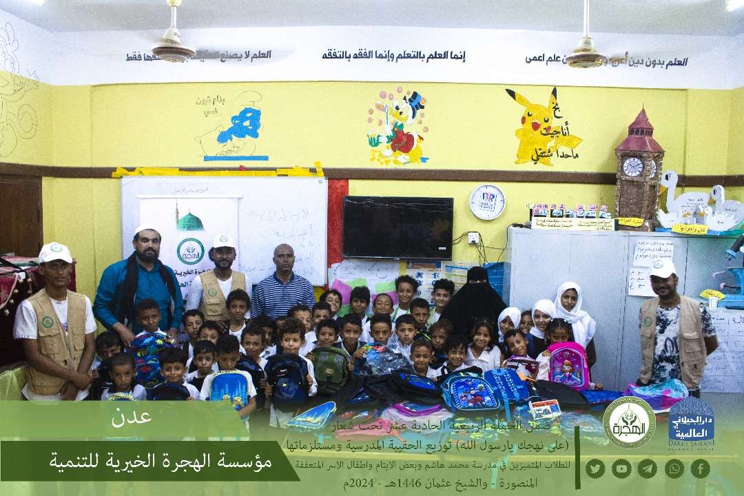 مؤسسة الهجرة تختتم مشروع توزيع الحقيبة المدرسية للأيتام وأبناء الأسر الفقيرة والنازحين بمناطق العاصمة عدن