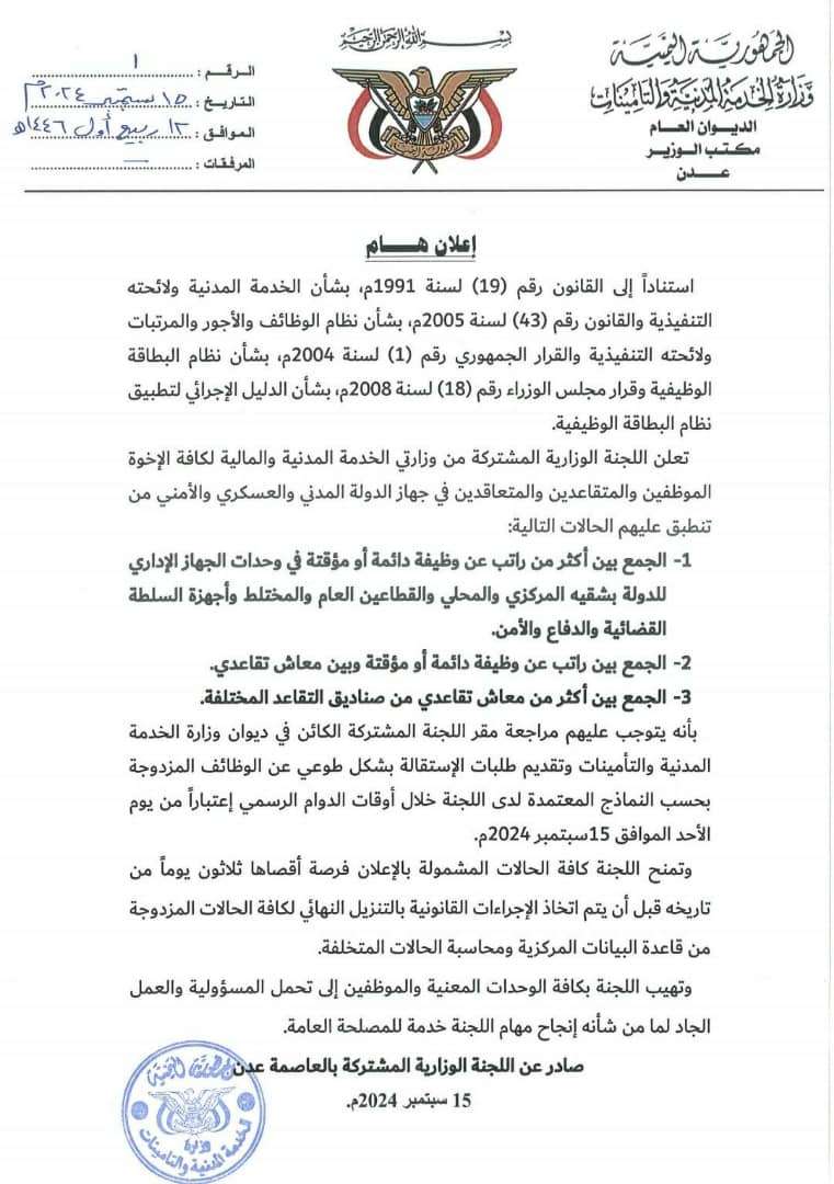 أعلنت اللجنة الوزارية المشتركة من وزارتي الخدمة المدنية والمالية، عن ضرورة قيام الموظفين والمتقاعدين والمتعاقدين في الجهاز المدني والعسكري والأمني بمراجعة أوضاعهم الوظيفية وفقًا للشروط المحددة. ويشمل الإعلان الذى تحصلت "سمانيوز" على نسخة منه، جميع الحالات التي تجمع بين أكثر من راتب أو معاش تقاعدي من الوظائف الدائمة أو المؤقتة في الجهاز الإداري للدولة، سواء في القطاع المدني أو العسكري، وأجهزة الأمن والقضاء. وقد حددت اللجنة ثلاث فئات رئيسية يتوجب عليها تقديم طلبات الاستقالة الطوعية عن الوظائف المزدوجة: 1. الموظفون الذين يتقاضون أكثر من راتب عن وظائف دائمة أو مؤقتة في وحدات الجهاز الإداري للدولة. 2. الأفراد الذين يجمعون بين راتب عن وظيفة دائمة أو مؤقتة وبين معاش تقاعدي. 3. الذين يجمعون بين أكثر من معاش تقاعدي من صناديق التقاعد المختلفة. وأكدت اللجنة ضرورة مراجعة الموظفين المشمولين في الإعلان مقر اللجنة المشتركة في ديوان وزارة الخدمة المدنية والتأمينات بالعاصمة عدن، وذلك اعتبارًا من يوم الأحد الموافق 15 سبتمبر 2024م، حيث يتعين عليهم تقديم طلبات الاستقالة الطوعية ضمن المهلة المحددة التي تبلغ ثلاثين يومًا. وشددت اللجنة على أن جميع الحالات المخالفة ستتعرض للإجراءات القانونية، بما في ذلك التنزيل النهائي من قاعدة البيانات المركزية ومحاسبة المتخلفين عن تقديم الطلبات ضمن المهلة المحددة. وأهابت اللجنة بكافة الوحدات المعنية والموظفين ضرورة التعاون الكامل لتحقيق الأهداف المرجوة من هذا الإجراء، وذلك حرصًا على المصلحة العامة.