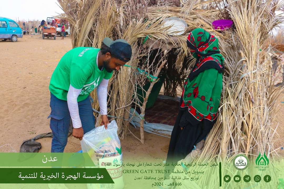 ضمن أعمال حملتها الربيعية السنوية الحادية عشر تحت شعار (على نهجك يارسول الله) ، وبإشراف مباشر من رئيس مؤسسة الهجرة السيد عبدالرحمن المحضار ، نفذت مؤسسة الهجرة الخيرية للتنمية بمحافظة عدن توزيع 140 سلة غذائية بتمويل من منظمة جرين جيت وفاعلي خير. وقد تم توزيع السلال الغذائية المقدمة من منظمة جرين جيت يوم الأربعاء ١٥ ربيع الأول ١٤٤٦هـ ، الموافق 18 سبتمبر 2024م ، واشتملت السلة الغذائية على (الأرز والدقيق والسكر والزيت) والتي استفاد منها 45 أسرة من النازحين بمحافظة عدن. كما تم توزيع السلال الغذائية المقدمة من فاعلي خير يومي السبت والأحد ١٨ - ١٩ ربيع الأول ١٤٤٦هـ ، الموافق 21 - 22 سبتمبر 2024م ، والتي استفاد منها 95 أسرة من أسر الأيتام وذوي الإحتياجات الخاصة والأسر المتعففة بعدة مناطق بالعاصمة عدن . حيث احتوت السلة الغذائية على (الأرز والدقيق والسكر والزيت والمكرونة والخوخ).