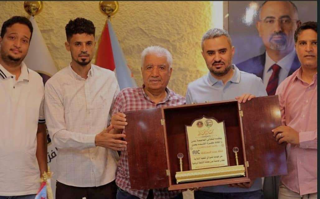 رئيس قطاع الإذاعة والتلفزيون يتسلّم درعا تكريميا من انتقالي العاصمة عدن واتحاد كرة القدم.