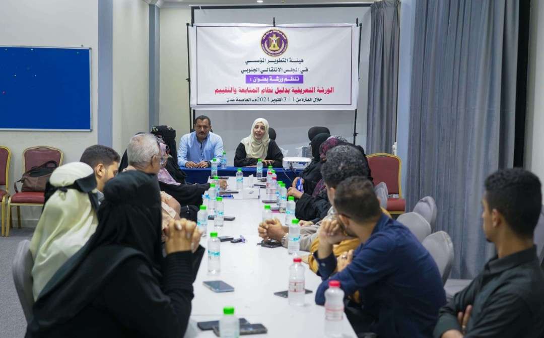 نظّمت هيئة التطوير المؤسسي للمجلس الانتقالي الجنوبي، اليوم الثلاثاء، بالعاصمة عدن، ورشة عمل تعريفية بدليل نظام المتابعة والتقييم، لنخبة من منتسبي الأمانة العامة والجمعية العمومية والهيئات المساعدة لرئاسة المجلس. ويتلقى المشاركون على مدى ثلاث ايام ، عددًا من الموضوعات المتصلة، بمفاهيم نظام المتابعة والتقييم، وأهمية مؤشرات الأداء في قياس وتحسين الأداء المؤسسي، فضلا عن الخطوات العشر المتبعة في نظام المتابعة والتقييم المبني على النتائج. وأكدت الدكتورة هدى السيد، نائب رئيس هيئة التطوير المؤسسي، خلال افتتاح الورشة، على أهمية هذا النظام في ضمان كفاءة وفعالية الأداء المؤسسي، مشيرة إلى أن الورشة تأتي في إطار سعي المجلس المتواصل لتطوير قدرات كوادره. وشددت الدكتورة السيد على ضرورة الاستفادة القصوى من هذه الورشة وعكس ما تم تعلمه في اداء مهامه اليومية، مؤكدة أن برنامج التخطيط والمتابعة والتقييم يعد أداة أساسية لقياس الاحتياجات ومتابعة تنفيذ الخطط وتحقيق الأهداف المنشودة.