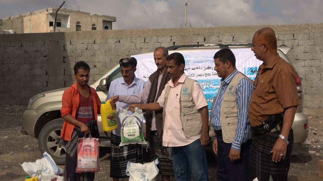 جمعية الوصول الإنساني بلحج توزع 129 سلة غذائية للأسر النازحة في مديرية المسيمير