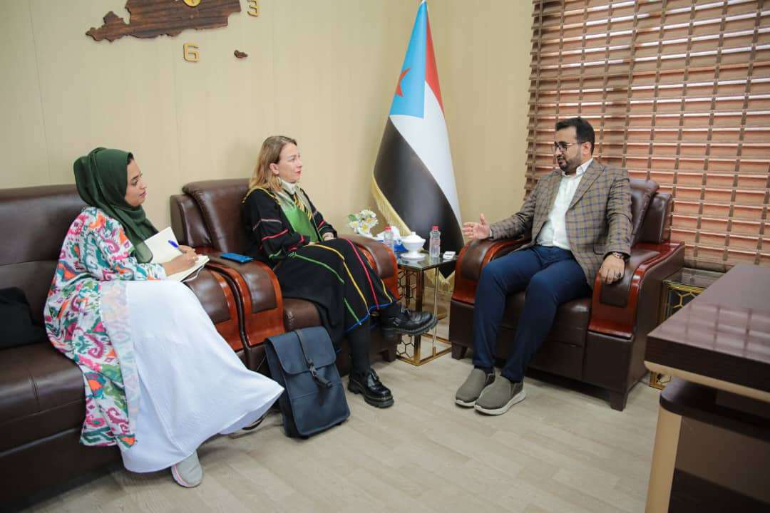 التقى سالم ثابت العولقي رئيس الهيئة الوطنية للإعلام المتحدث الرسمي باسم المجلس الانتقالي الجنوبي اليوم في مكتبه بالعاصمة عدن السيدة شايدا حسن المدير العام لمنظمة المساعدات الإنسانية والصحافة الفرنسية. وفي اللقاء أكد العولقي أننا حريصون على التنسيق والتعاون مع كل المنظمات الدولية العاملة في مختلف المجالات ، مشير إلى ان الاستقرار الذي تعيشه العاصمة عدن يجعل منها البيئة الأمثل للعمل المدني والإنساني. وأشار العولقي إلى أن عدن ومدن الجنوب تستحق الكثير من فرص التأهيل وبناء القدرات للشباب والشابات الجنوبيين نظرا للأوضاع الاقتصادية والمعيشية الصعبة التي يعيشونها، منوها بأهمية التوجه نحو تأهيل الكوادر الاكاديمية وطلاب كلية الاعلام بجامعة عدن في برامج المنظمة. من جانبها استعرضت السيدة شايدا حسن برنامج عمل منظمة المساعدات الإنسانية والصحافة ومشاريعها الحالية والمستقبلية ، مؤكدة أن العاصمة عدن هي المكان المناسب لإقامة الدورات باعتبارها الحاضنة لكل مدن الجنوب ومختلف الشرائح وخاصة المرأة.