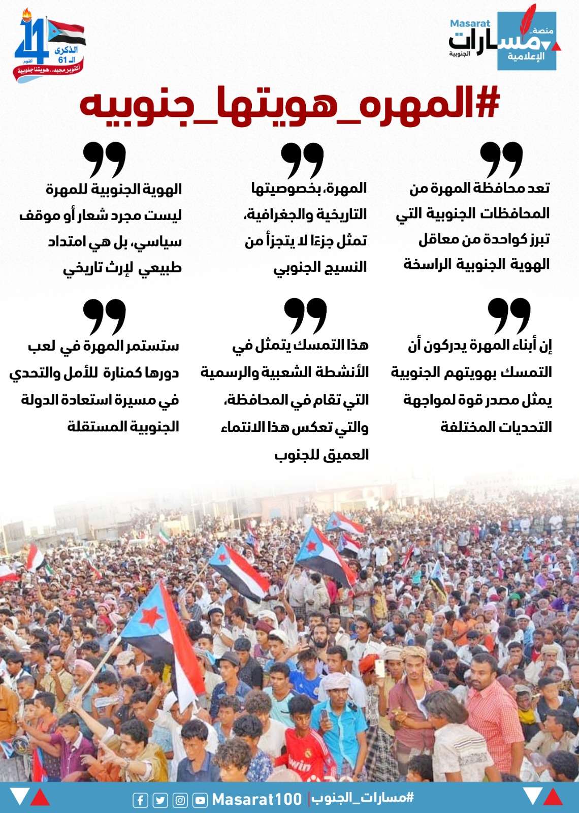 احتضنت عاصمة محافظة المهرة الغيضة عصر اليوم السبت احتفالية ذكرى أكتوبر المجيدة تحت شعار «هويتنا جنوبية» والتي شهدت حضورا فاعلاً وزخماً جماهيريا كبير. حيث عبر ابناء المهرة خلال الاحتفالية الكرنفالية عن دعمهم لأهداف ثورة أكتوبر، مستذكرين تضحيات الأجداد الذين حملوا راية الكرامة والحرية والعدالة في سبيل أرضهم وحيث تمثل ساحة الغيضة احتفالا بالحرية والسير على خطى ثوار أكتوبر حتى استعادة الدولة الجنوبية. حيث أن مليونية الغيضة جسدت صورة لا تنسى، حيث أكد أبناء المهرة أن دولتهم الجنوبية حق غير قابل للتفاوض وأن الهوية الوطنية الجنوبية ستبقى متجذرة في نفوسهم مهما كانت الظروف المحيطة بهم. وارتفعت الأصوات الشعبية والرسمية لأبناء المهرة للمشاركة في مليونية الهوية الجنوبية في الغيضة وهي رسالة واضحة تضمنت الحاشدة المهرية الممتدة كالنهر المتدفق حاملة معها آمال وتطلعات الشعب الجنوبي الذي يجدّد نضاله. وقد أكد ابناء المهرة وقوفهم خلف المجلس الانتقالي الجنوبي، متعهدين بمواصلة النضال من أجل استعادة هويتهم ودولتهم موضحين للعالم أن الأرض أرضنا والقرار لنا إنه المكان الذي نعيش فيه أو نموت فيه. مؤكدين على أن محافظة المهرة جزء لا يتجزأ من الجنوب ولن تتخلف عن الموكب الجنوب الساعي إلى استعادة الدولة الجنوبية الفيدرالية المستقلة وترفض الاحتلال اليمني وتطالب برحيله في اسرع وقت ممكن. وقال رئيس القيادة المحلية للمجلس الانتقالي الجنوبي في محافظة المهرة الأستاذ مجاهد بن عفرار خلال الاحتفالية الكرنفالية: اليوم تستكمل المهرة خريطة طريق تحقيق حلم أبناء الجنوب في الحرية والاستقلال على كامل ترابه من "ضربة علي" شرقاً إلى "رأس عمران" غربًا. وإننا نحتفل اليوم بذكرى ثورة أكتوبر المجيد لنستمد منها دروسًا عظام وذخيرة نضال لبناء الدولة الجنوبية الفيدرالية. وأضاف رئيس انتقالي المهرة مجاهد بن عفرار: تحتشد المهرة اليوم رافعة رايات الجنوب وصادحة بهواها وهويتها الجنوبية الأصيلة مؤكدة على موقفها الثابت مع المشروع الوطني الجنوبي.فالمهرة جزء أصيل من الجنوب وستكون الصخرة الجنوبية الصلبة التي ستتحطم عليها كل المؤامرات. وأن أبناء المهرة لن يتوانوا عن خوض المعركة الفاصلة إلى جانب اخوانهم الجنوبيين لتحقيق النصر المؤزر للجنوب. وأشار بن عفرار في الاحتفالية أن تحركات الرئيس القائد عيدروس الزُبيدي الخارجية جاءت لتؤكد للعالم عدالة قضية شعب الجنوب ومحورية قيام دولته كاملة السيادة. وأكد بن عفرار بأن المهرة ترفض بقاء القوات الوافدة من المناطق الحوثية والمتحوثة وترفض أي حلول ترقيعية لا ترقى لمطلب كل أبنائها، وأن بناء قوة من أبناء المهرة تتولى تأمينها والدفاع عنها هو مطلب هام لأبناء المحافظة. تفاعل جنوبي في مليونية هويتنا جنوبية في المهرة: اطلق سياسيون وناشطون جنوبيون عصر اليوم السبت وسم #المهره_هويتها_جنوبيه على منصة (أكس)، وباقي وسائل التواصل الاجتماعي. وابرزوا فعالية الذكرى الـ61 لثورة 14 أكتوبر التي تُقام حاليا في محافظة المهرة، مؤكدين على أن المهرة هي جزء أصيل من الجنوب، وأن أبناءها مرتبطون تاريخيًا وجغرافيًا وثقافيًا ببقية محافظات الجنوب". مسلطين الضوء على الدور البطولي الذي لعبه أبناء المهرة في ثورة 14 أكتوبر، حيث شاركوا في مختلف جبهات القتال وتصدوا للاستعمار البريطاني بكل شجاعة وإصرار. مشيدين بالتضحيات الجسيمة التي قدمها أبناء المهرة من أجل الحرية والاستقلال، حيث قدموا أرواحهم ودمائهم فداءً للوطن. مؤكدين على أهمية الحفاظ على مكتسبات ثورة 14 أكتوبر، والعمل على تعزيز الوحدة الوطنية الجنوبية بين أبناء كافة الجنوب. معتبرين محافظة المهرة حصن نضالي في ثورة 14 أكتوبر، مشيرين إلى دورها كأحد القلاع النضالية التي ساهمت بشكل حاسم في إشعال ثورة 14 أكتوبر ضد الاستعمار البريطاني. كما أكدوا على أن أبناء المهرة كانوا وسيظلون جزءا فاعلا في صياغة مستقبل الجنوب. مجددين التأكيد على الهوية الجنوبية لمحافظة ا