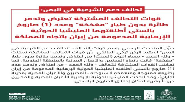 أعلنت قيادة القوات المشتركة للتحالف العربي، مساء اليوم السبت، عن اعتراض وتدمير طائرة مسيرة وصاروخ بالستي أطلقه الحوثيون باتجاه السعودية. وقال المتحدث باسم التحالف العربي، العقيد تركي المالكي، إن قوات التحالف تمكنت مساء اليوم السبت من اعتراض وتدمير طائرة بدون طيار مفخخة، كانت تستهدف المدنيين، والأعيان المدنية بالمنطقة الجنوبية بالمملكة. كما أعلن "المالكي" أن التحالف اعترض ودمر صاروخ بالستي أطلقه الحوثيون باتجاه جازان، مؤكداً أن الحوثيين اتخذوا من الأعيان المدنية والمدنيين دروعا بشرية لمكان إطلاق الصاروخ البالستي.