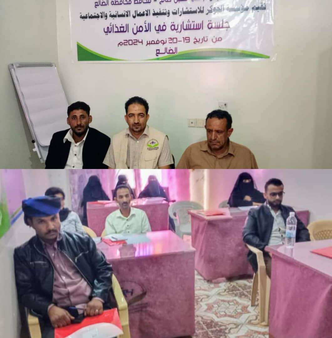 نظمت مؤسسة الجوكر اليوم الثلاثاء بمحافظة الضالع جلسة استشارية حول تأثير الأمن الغذائي والتي أستهدافت جانب من اللجان المجتمعية والنشطاء والمؤسسات المحلية العاملة في الجوانب الإنسانية في دعم مشاريع الغذاءوبرعاية كريمة من محافظ المحافظة اللواء الركن علي مقبل صالح. افتتحت الجلسة الذي حضرها مدير عام الشؤون الاجتماعية بالمحافظة عائد محمود، ورئيس مؤسسة الجوكر امين محمود بكلمة ترحبية من قبل صلاح محمد قائد مستعرضًا أهداف الجلسة والحلول الممكنة في تحقيق الأمن الغذائي. وتناولت الجلسة العديد من المحاور ،ومنها تعزير الوعي بأهمية الأمن الغذائي، والتوعية حول تأثير الأمن الغدائي وكيفية الحلول المعالجة لتعزيز الأمن الغذائي، بالإضافة إلى استعراض المشاركين المقترحات وأولويات القضايا والحلول الممكنة لها والطرق التعامل لحلها. إلى ذلك أوضح رئيس مؤسسة الجوكر أمين محمود إن الجلسة أستهدفت 15 مشارك ومشاركة وتستمر لمدة يومين ، وتهدف إلى التوعية حول تأثير الأمن الغذائي في محافظة الضالع وتقديم حلول عملية لتعزيز الأمن الغذائي