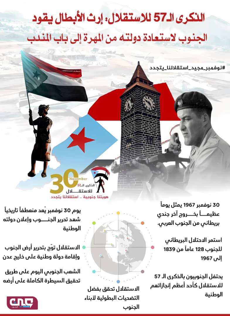 يحتفل ابناء الجنوب العربي في عموم محافظات الجنوب بالذكرى السابعة والخمسين لعيد الاستقلال الوطني الجنوبي الـ 30 من نوفمبر المجيدة التي من خلالها يستذكر شعب الجنوب تاريخ ونضال وثورة اجدادنا وكفاحهم المسلح ضد الاحتلال والاستعمار البريطاني. وفي هذه الذكرى الوطنية الجنوبية المجيدة يستذكر الشعب الجنوبي بطولات امجادهم ويغرسون روح الانتماء للجنوب وتعريف الأجيال الجنوبية الجديدة بتاريخ الاستقلال ونضال الشعب الجنوبي آنذاك. كما ينمّي عقول تلك الاجيال على تطلعات الشعب الجنوبي التواق لاستعادة دولته المستقلة كاملة السيادة على حدودها المتعارف عليها دوليا قبل عام 1990م. مشددين على أهمية تماسك الصف الجنوبي والذي يعتبره كل الجنوبيين شرط أساسي لتحقيق الاستقلال الثاني. في هذه الاحتفالية الوطنية والمناسبة العظيمة، أقدم المجلس الانتقالي الجنوبي على تحقيق العديد من النجاحات السياسية والعسكرية التي تحققت في خدمة المشروع الوطني الجنوبي. وهذه الذكرى السابعة والخمسين لعيد الاستقلال الوطني الجنوبي 30 نوفمبر تربط كل أطياف شعب الجنوب بالجهود المعاصرة لاستكمال التحرير والاستقلال وتحقيق السيادة الكاملة على الأرض الجنوبية من المهرة شرقا إلى مضيق باب المندب غربا على حدودها المتعارف عليها دوليا قبل عام 1990م. ولد سعت قيادة المجلس الانتقالي الجنوبي إلى تعزيز الحضور الإقليمي والدولي لقضية شعب الجنوب التحررية. والتي أكدت للعالم بأحقية ابناء الجنوب في استعادة الدولة الجنوبية المستقلة وفق القوانين الدولية. توحيد الجبهة الداخلية في الجنوب: يجب على القيادة السياسية الجنوبية أن تعمل على توحيد الجبهة الداخلية الجنوبية من خلال خلق وعي شعبي موحد، وتثقيف المجتمع الجنوبي بأهمية التكاتف خلف المجلس الانتقالي الجنوبي الذي يعتبر هو الممثل الوحيد لتطلعات شعب الجنوب في استعادة سيادته. فدولة الجنوب تاريخ ودولة ذات سيادة وعلم وهوية وقانون. رسالة جنوبية: شعبنا الجنوبي الذي يحتفل اليوم بالذكرى النوفمبرية يعمل على إيصال رسالة سياسية واضحة للمجتمعين الإقليمي والدولي حول تطلعات شعب الجنوب ودور المجلس الانتقالي الجنوبي كشريك استراتيجي.، موضحاً أهمية استعادة الدولة الجنوبية كاملة السيادة على حدودها المتعارف عليها دوليا قبل عام 1990م في تعزيز الأمن والاستقرار الإقليمي والدولي، ودورها المحوري في مكافحة الإرهاب وتأمين المصالح الدولية. مؤكدين على أن أبناء الجنوب يلتفون حول المشروع الوطني الجنوبي بقيادة المجلس الانتقالي ، والدفاع عن مكتسبات الجنوب. مجددين التأكيد على أن تحقيق استقلال واستعادة دولة الجنوب كاملة السيادة على حدودها المتعارف عليها دوليا قبل عام 1990م مفتاح السلام المستدام في المنطقة. مشيرين بأن معاناة شعب الجنوب الناتجة عن سياسات التجويع وحرب الخدمات وتأخير الرواتب التي تمارسها قوى الاحتلال والإرهاب (الإخوانية والحوثية والشمالية في الشرعية اليمنية) تهدف إلى تركيع الشعب وإضعاف إرادته. وإضعاف جهود المجلس الانتقالي الجنوبي في مواجهة تلك المؤامرات والمخططات الاقتصادية التي تستهدف حياة المواطنين واستقرارهم. مضيفين بأن تعزيز الوعي الشعبي حول الأهداف السياسية للمجلس الانتقالي الجنوبي مهم جدا في حماية مصالح الجنوب، والدفاع عن حقوق شعبه، مؤكدين على أن المجلس الانتقالي الجنوبي يعمل على تحسين الظروف الاقتصادية والمعيشية كجزء من مسار استعادة دولة الجنوب على حدودها المتعارف عليها دوليا قبل عام 1990م. هيئة رئاسة الانتقالي الجنوبي وذكرى نوفمبر: حيّت هيئة رئاسة المجلس الانتقالي الجنوبي خلال اجتماعها الدوري، يوم الخميس، برئاسة الأستاذ علي عبد الله الكثيري، القائم بأعمال رئيس المجلس ورئيس الجمعية الوطنية، وبحضور وزراء المجلس ورؤساء هيئاته، جماهير شعبنا الجنوبي في الداخل والخارج، وقواته المسلحة، بمناسبة حلول الذكرى الـ57 لعيد الاستقلال المجيد 30 نوفمبر، معربة عن فخرها واعتزازها بعظمة ه