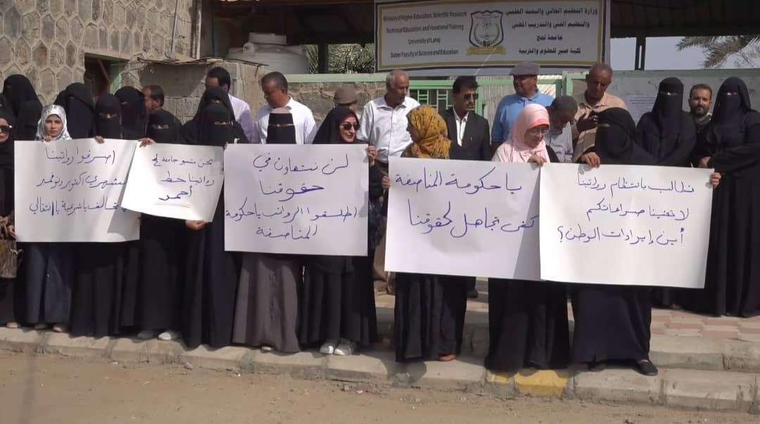 اساتذة جامعة لحج ينفذون وقفة احتجاجية ويمهلون الحكومة شهرا لتحقيق مطالبهم