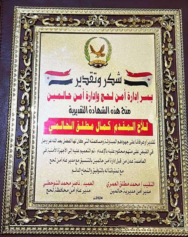 كرمت قيادتا أمن لحج وحالمين، ممثلتين بالعميد/ناصر محمد الشوحطي / والنقيب محمد العمري، كرمتا المقدم/ كمال الحالمي، قائد وحدة حماية الأراضي، تقديراً لجهوده المتميزة والتعاون البناء في القبض على قاتل محكوم عليه. جاء هذا التكريم استجابةً للدور الفاعل الذي لعبه المقدم/ الحالمي ووحدته في الاستجابة السريعة لبلاغ عملياتي حول شخص محكوم عليه بالإعدام، فرّ من وجه العدالة. وأظهرت وحدة حماية الأراضي، من خلال القوة التابعة لها في موقع سوق قات الممدارة بقيادة الملازم عبد الصمد العمري قائد طوارئ الوحدة، أظهرت يقظةً واحترافيةً عاليتين في القبض على المتهم الذي كان قد تسلل لشراء القات متنكراً في منطقة الهناجر بالممدارة، شمال مديرية الشيخ عثمان بعدن. حيث ان المذكور تم التعميم عليه من قبل ادارة امن عدن والجهات المختصة ، وعلى ضوء ذلك تمكنت الوحدة من إلقاء القبض على المتهم بعد أن شكت به من مظهره المريب ، ومحاولته تحاشي الجنود والهروب ، إلا أن أفراد الوحدة أحبطت محاولة الهروب تلك. هذا وقد تم تسليم المتهم بالتنسيق مع مدير امن عدن العميد مطهر الشعيبي الى امن لحج. وأثنت قيادتا أمن لحج وحالمين على جهود وحدة حماية الأراضي مؤكدتين أهمية التعاون الأمني المشترك في مكافحة الجريمة والحفاظ على الأمن والاستقرار. وأكدت إدارة أمن لحج وحالمين على أهمية هذا الإنجاز الأمني، معربتان عن تقديرهما للدور الكبير الذي لعبته وحدة حماية الأراضي في القبض على المتهم بعد أشهر من الفرار وهنأت القيادة الأمنية في لحج وحالمين جميع أفراد وحدة حماية الأراضي وعلى رأسهم قائدهم، المقدم/ كمال الحالمي، على هذا الإنجاز والتفاعل الكبير، متمنين لهم المزيد من التوفيق والنجاح في مهامهم. وبدوره قدم ، المقدم/ كمال الحالمي جزيل الشكر والعرفان إلى مدير أمن عدن العميد/ مطهر الشعيبي الذي تابع تلك العملية بشكل مباشر واثمرت متابعته عن القاء القبض على المتهم، كما تقدم بالشكر الى قيادة امن لحج وادارة امن حالمين على هذا التكريم له ولوحدة حماية الاراضي الذي عزز الروح المعنوية لمواصلة تلك الجهود مستقبلا.