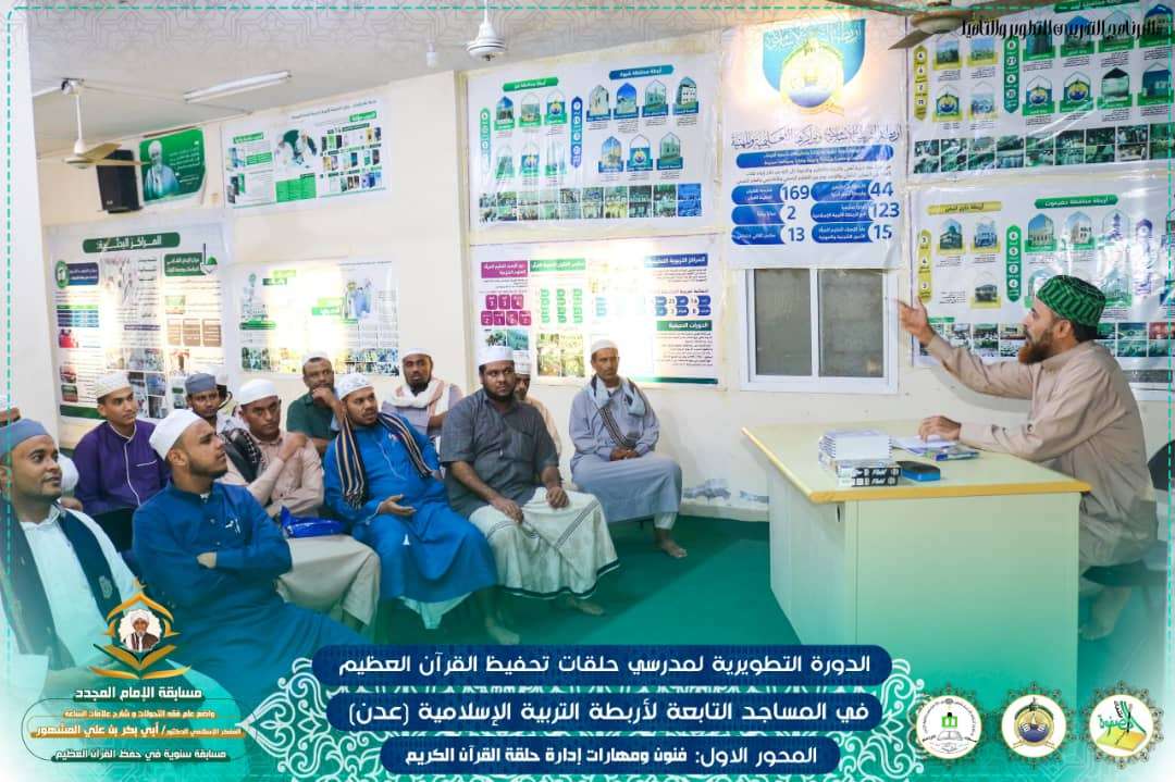 بنظر مجلس مكتب الموجه العام للأربطة الإسلامية، وبرعاية منتدى شباب الصفوة بالعاصمة عدن، وتنظيم مسجد التراحم بمدينة الشعب، افتتحت "الدورة التطويرية لمدرسي حلقات تحفيظ القرآن العظيم" ليلة أمس السبت 6 /جماد الآخرة/ 1446هـ، والتي تأتي ضمن البرنامج التدريبي للتطوير والتأهيل المهاري لمدرسي حلقات تحفيظ القرآن العظيم للمساجد التابعة للأربطة الإسلامية، والمشارِكة في مسابقة الإمام المجدد الدكتور أبي بكر العدني بن علي المشهور القرآنية الرمضانية السنوية. والذي تم من خلالها استضافت الشيخ المقرئ أحمد سالم محول، مدير دار المشهور للقرآن والقراءات بمدينة أحور، وتتواصل على مدى اسبوعاً كاملاً، بقاعة رباط الإمام المشهور بعدن، حيث ستركز على محورين، المحور الأول "فنون ومهارات إدارة حلقة القرآن الكريم" والمحور الثاني "أحكام نظرية وملاحظات تطبيقية في علم التجويد".