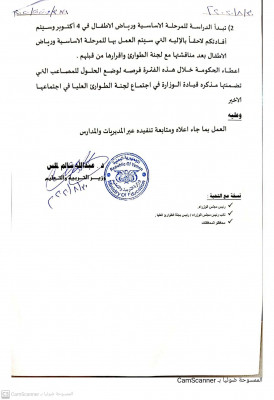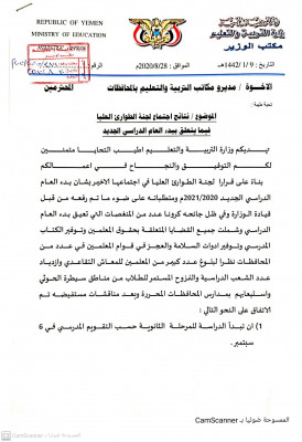 وجاء في التعميم الصادر من قبل معالي الدكتور عبدالله سالم لملس وزير التربية والتعليم صباح اليوم.. انه جاء التأجيل للمرحلة الأساسية ورياض الاطفال بعد مناقشة مع لجنة الطوارى وأقرارها وايضاً لإعطاء الحكومة خلال هذه الفترة فرصة لوضع الحلول للمصاعب التي تضمنتها مذكرة قيادة الوزارة في إجتماع اللجنة الوطنية العليا للطوارئ لمواجهة وباء كورونا المستجد الخميس الماضي 27/ 8/ 2020م برئاسة رئيس الوزراء الدكتور معين عبدالملك والتي اهمها تعقيم وتطهير المدارس وتوفير الكمامات للمعلمين والمعلمات والطواقم التعليميةو توفير جهاز فحص حراري لكل مدرسة بعدد (7000) جهاز وصرف العلاوات السنوية للمعلمين منذ 2014م واجراء التسويات لموظفي 2011م وفتح باب التعاقد مع معلمين وطباعة الكتاب المدرسي .