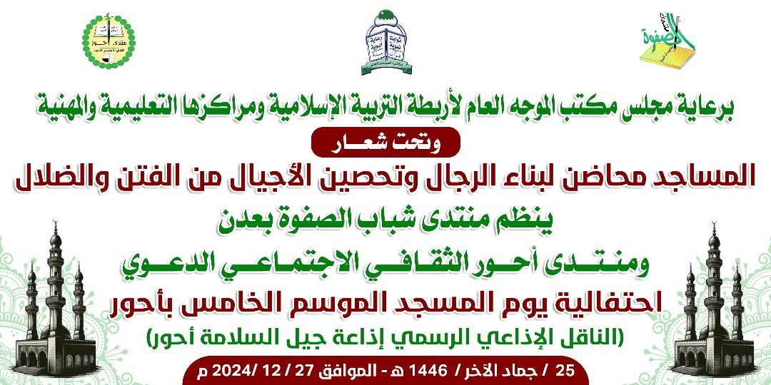 تستعد مدينة أحور خلال هذا الأسبوع لاحتضان احتفالية يوم المسجد الكبرى تحت شعار (المساجد محاضن لبناء الرجال وتحصين الاجيال من الفتن والضلال)، والتي تقام للعام الخامس على التوالي، حيث سيحتضن جامع "حصن الشيخ" يوم الجمعة القادمة الفعالية بين صلاتي المغرب والعشاء. الاحتفالية: ستشمل تكريم أكثر من (350 فردًا) من معلمي حلقات التعليم بالمساجد، والأئمة، والمؤذنين، والقائمين على خدمة بيوت الله، والمنتمين لمكونات العمل الدعوي بأحور. بالإضافة إلى تكريم أكثر من (600 طالب) في حلقات التعليم الأبوي في جميع مساجد مديرية أحور. الفعاليات: سيتبع الحفل التكريمي أمسية ثقافية ضمن مهرجان يوم المسجد، تستضيفها خيمة المنتدى الكبرى. سيحضرها شخصيات اجتماعية ودينية وجمع غفير من الأهالي. سيتخلل الأمسية برامج وفقرات ممتعة، بالإضافة إلى الكلمات والقصائد الشعرية ومشهد مسرحي شيق وأناشيد دينية تقدمها الفرقة الإنشادية بمنتدى أحور. كما سيتم السحب على جوائز عينية ونقدية قيّمة. أهداف الاحتفالية: ويأتي هذا التكريم الكبير نظيرًا لبروز مدينة أحور بروزًا مميزًا في الاهتمام بالتعليم الأبوي النبوي الشرعي، اهتمامًا كبيرًا نتج عنه توجه معظم الشباب إلى الأربطة الإسلامية والمساجد ودور القرآن الكريم والتحاق البعض بالمكونات الدعوية الأخرى. المنظمون: تقام فعاليات يوم المسجد في مدينة أحور للمرة الخامسة على التوالي، بدعم من "منتدى شباب الصفوة" بمدينة عدن وتنظيم "منتدى أحور الثقافي الاجتماعي الدعوي" برعاية كريمة من مجلس مكتب الموجه العام لأربطة التربية الإسلامية ومراكزها التعليمية والمهنية. -صادر عن القسم الإعلامي بمنتدى أحور الإثنين ٢١ جماد الثاني ١٤٤٦