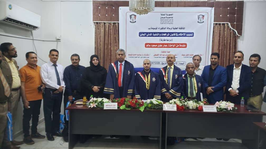 نال القاضي عمار علوي مسعود، رئيس محكمة الميناء الابتدائية، درجة الدكتوراه بتقدير امتياز عن رسالته الموسومة بعنوان: "تسبيب الأحكام في قانون المرافعات والتنفيذ المدني اليمني (دراسة مقارنة)"، والتي جرى مناقشتها اليوم في جامعة عدن. حضر المناقشة القاضي صباح العلواني، عضو مجلس القضاء الأعلى، والقاضي شائف الشيباني، رئيس دائرة التدريب والتأهيل بمكتب النائب العام، والقاضي شوقي جرهوم، رئيس المحكمة التجارية الابتدائية، والقاضي نزار محمد رئيس محكمة صيرة الابتدائية، والقاضي عبدالقادر الفضلي، رئيس شعبة الإبتزاز الالكتروني، إلى جانب عدد من الأكاديميين والقضاة. تكونت لجنة المناقشة من البروفسور محمد مقبل سيف، المشرف العلمي للرسالة (كلية الحقوق، جامعة عدن)، والدكتور سامح حامد منيعم، عضو ومناقش داخلي (كلية الحقوق، جامعة عدن)، والدكتور غالب عبدالله القعيطي، عضو ومناقش خارجي (كلية الحقوق، جامعة حضرموت). تناولت الرسالة تحليلًا معمقًا لتسبيب الأحكام القضائية في قانون المرافعات والتنفيذ المدني اليمني، مع مقارنتها بالقوانين المماثلة في الأنظمة القضائية الأخرى، لتقديم مقترحات تسهم في تحسين جودة العمل القضائي وتعزيز مفهوم العدالة. وفي الختام، أوصت لجنة المناقشة باعتماد الرسالة كمقرر دراسي في كليات الحقوق بشكل عام، ولطلاب المعهد العالي للقضاء بشكل خاص، لما لها من أهمية علمية وعملية تسهم في تطوير الأداء القضائي.