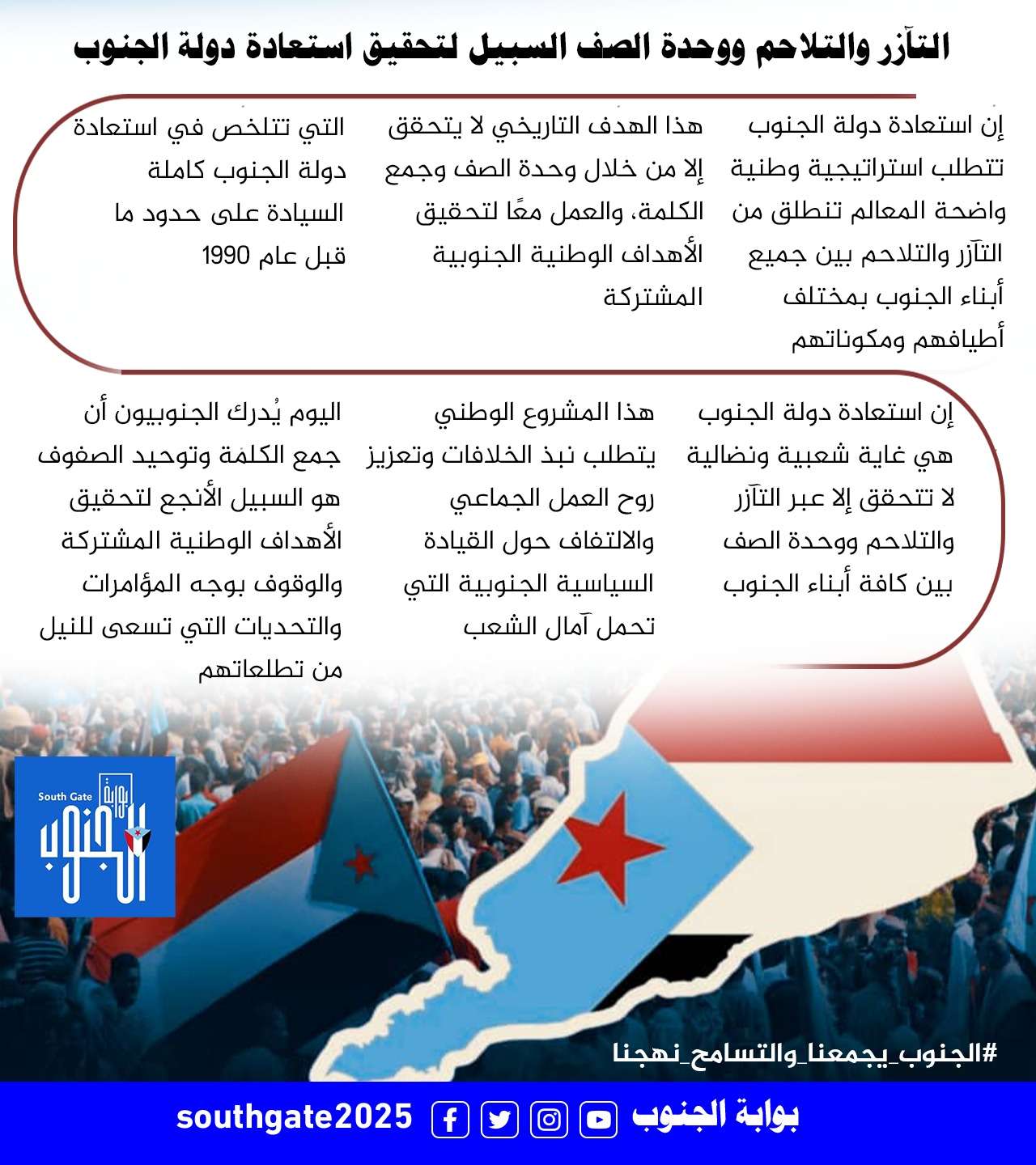سلط ناشطون وسياسيون جنوبيون الضوء على حلول الذكرى الـ (19) للتصالح والتسامح الجنوبي. واطلق ناشطون وسياسيون جنوبيون، عصر اليوم الأحد 12 يناير / كانون ثاني 2025م، هاشتاج #الجنوب_يجمعنا_والتسامح_نهجنا على مواقع التواصل الاجتماعي، اشهرها منصة (أكس). وتزامن الهاشتاج مع حلول الذكرى الـ (19) للتصالح والتسامح الجنوبي، والذي تُصادف يوم الإثنين 13 يناير 2025م. وأكدوا على أن التصالح والتسامح الجنوبي يُعد الحدث الأعظم والمحطة التاريخية الذي تخطى فيه شعب الجنوب الكثير من المنعرجات، داعيين أبناء الجنوب إلى أهمية مواصلة تعزيز الوحدة الشعبية، والتكاتف بين أبناء الجنوب خلف المجلس الانتقالي الجنوبي بقيادة الرئيس القائد عيدروس الزُبيدي. وأكدوا على أن أعداء الجنوب يراهنون هزيمة الجنوب هو تفتيت التماسك الجنوبي، وبث روح الفرقة، وزرع الصراع المناطقي بين أبناء شعب الجنوب باعتباره السبيل الوحيد لهزيمة الجنوب، ويبذلون قصارى جهدهم وامكانياتهم لتغذية النعرات المناطقية ليسهل لهم ابتلاع الجنوب وكسره وهزيمته. وأشاروا إلى أن شعب الجنوب، ومن خلال التصالح والتسامح الجنوبي، استلهم العبّر من جراحات الماضي، لينطلق صوب المستقبل من أجل تحقيق هدف الشهداء الذين قدموا أرواحهم في سبيل استعادة هوية ودولة الجنوب، مؤكدين على أن أبناء الجنوب يؤمنون بأهمية توحيد الصف لتحقيق استعادة دولة الجنوب كاملة السيادة، وتحقيق الاستقرار. وحثوا على أهمية نشر ثقافة التسامح والمحبة كنهج لحل أي تباينات أو وجهات نظر في اطار البيت الداخلي الجنوبي. وأكدوا على مواصلة الطريق حتى استعادة دولة الجنوب كاملة السيادة، بكامل ترابها الوطني. كما قالوا: "من ثمار التصالح والتسامح الجنوبي، يتمثل في اصطفاف الجنوبيين نحو أهدافهم، وتشكيل المجلس الانتقالي الجنوبي بقيادة الرئيس القائد عيدروس الزُبيدي، الذي أسس القواعد الصلبة لتلك الذكرى تحت شعار (الجنوب لكل وبكل أبنائه)، وذلك بمراحل التأسيس وإعلان الحوار الوطني الجنوبي الشامل، مرورًا بميثاق الشرف الوطني، وصلًا إلى الاجتماع التأسيسي لمجلس العموم للمجلس الانتقالي الجنوبي". واعتبروا يوم 13 يناير 2006م، من أهم المحطات التاريخية في مسيرة الجنوب وشعبه وقضيته. وأكدوا على أن المجلس الانتقالي الجنوبي بقيادة الرئيس القائد عيدروس الزُبيدي، بذل جهودًا جبارة، بهدف الحفاظ على المُنجزات السياسية التي تحققت خارجيًا وداخليًا، والحفاظ على مكتسبات شعب الجنوب العظيم، وكذا الحفاظ على الانتصارات التي حققتها القوات المُسلحة الجنوبية. كما تذكروا حرب صيف 2015م، التي شنتها ميليشيا الحوثي الإرهابية، وجماعات الهالك عفاش ضد الجنوب، وتلبية كافة أبناء الجنوب بكل أطيافهم ومشاربهم، لنداء الدفاع عن الأرض والشرف والعرض والتراب الجنوبية، أكد على مدى تلاحم أبناء الجنوب. واكدوا على أن شعب الجنوب عزز في 13 يناير 2006م، أعمدة مسيرة ثورته التحررية، وبنيانها الجماهيري والسياسي والتنظيمي المرصوص. وأشاروا إلى أن التصالح والتسامح الجنوبي كان، ومازال، وسيظل النهج الأصيل المستمر، الذي ينير الطريق، ومبدأً ساميًا نبيلًا حاضرًا قولًا، وفعلًا، وفكرًا، وسلوكًا، وممارسة، في جميع مناحي الحياة. وذكروا عدد من الأمثلة التي جسدت التصالح والتسامح بين القبائل والمجتمعات الجنوبية، مؤكدين على أن يوم 13 يناير 2006م، كسر رهان الأعداء بتحويل ذكرى أليمة إلى مناسبة للتصالح والتقارب والعمل الوطني الجنوبي الموحد. وأضافوا: "من أهم ثمار التصالح والتسامح الجنوبي تشكيل المجلس الانتقالي الجنوبي، الذي يقود نضال شعب الجنوب بإرادة صلبة حتى وصل إلى ما وصل إليه اليوم من انتصارات ونجاحات وإنجازات أعادت للجنوب مكانته وقراره". وبينوا بأن مشروع التصالح والتسامح الجنوبي، يؤكد مدى مستوى الوعي الوطني والأخلاقي الذي جسده شعب الجنوب، منوهين بأهمية تعزيز الهوية الجنوبية وموروثها الثقافي والتاريخي. ودعوا إلى دعم جهود المجلس الانتقالي الجنوبي بقيادة ا
