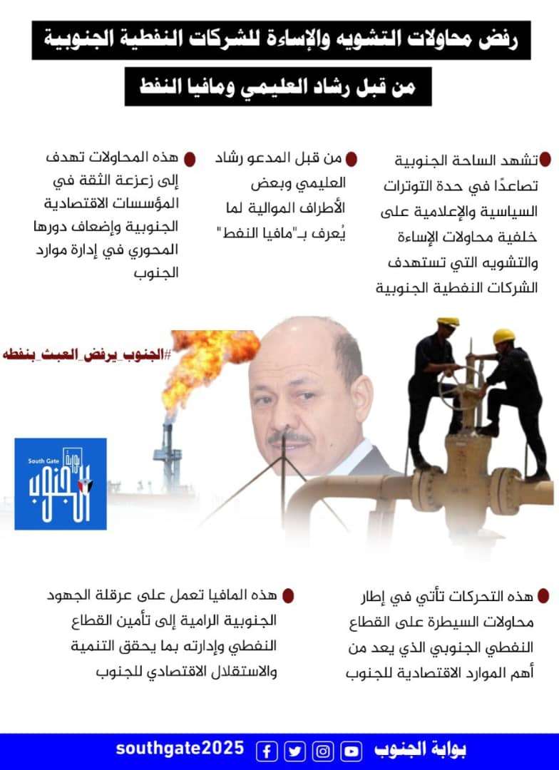 أكد الشارع الجنوبي عن رفضه لما يقوم به الشماليين من تقاسم لقطاعات النفط في شبوة وحضرموت، ورفض محاولاتهم التشويهية والإساءة للشركات النفطية الجنوبية من قبل رشاد العليمي ومافيا النفط. وأشار الشارع الجنوبي بأن مساعي المدعو رشاد العليمي ومافيا النفط، مفضوح والذي يهدف إلى تمكين الشركات النفطية الشمالية من الاستيلاء على ثروات الجنوب، مطالبين بسرعة تحرير الشركات النفطية من هيمنة لوبي الفساد اليمني الشمالي.مؤكدين على أن تحرير الشركات النفطية من هيمنة لوبي الفساد اليمني الشمالي لهو أهم إنجاز لشعب الجنوب لشق طريقة نحو التنمية المستدامة. وأعلن ابناء الجنوب تأييدهم لما جاء في بيان القيادة المحلية للمجلس الانتقالي الجنوبي في محافظة شبوة، وبيان اللجنة التحضيرية لمؤتمر شبوة الشامل. مؤكدين على أن الوضع الذي تعاني منه شبوة وحضرموت جراء فساد رشاد العليمي، هدفه الاستمرار في السيطرة والاستحواذ على امتيازات النفط في حضرموت وشبوة وسائر محافظات الجنوب. كاشفين كيفية استيلاء لوبي الفساد اليمني الشمالي على قطاعات النفط في حضرموت وشبوة، وذلك من خلال استغلاله فقدان الدولة للجاهزية الفنية والقانونية والمؤسساتية من خلال مافيا الفساد اليمني الشمالي. مشيرين على أن حرب الخدمات في العاصمة الجنوبية عدن وباقي محافظات الجنوب هي وسيلة من وسائل رشاد العليمي واتباعه بهدف إخضاع الجنوب وشعبه لصالح الاجندات اليمنية. منوهين بأن مختلف محافظات الجنوب تتعرض للاستهداف من قبل لوبي الفساد ليمني الشمالي، حيث تأتيان حضرموت وشبوة في مقدمة عمليات السطو الممنهج، لما تمتازان به من ثروات كبيرة من النفط والغاز. مؤكدين رفضهم محاولات نائب مدير شركة (OMV) عز الدين الحكيمي ووفد رشاد العليمي، محاولاتهم التفاوض حول نفط شبوة وحضرموت. مشيرين بأن وزارة النفط والمعادن قامت بإرسال (6) موظفين من أبناء تعز اليمنية، بتعليمات من رئيس مجلس القيادة الرئاسي رشاد العليمي، وذلك إلى دولة مصر للمشاركة في المفاوضات القادمة حول حقول نفط شبوة، واقصاء أبناء شبوة من المشاركة في المفاوضات المصرية بشكل متعمد. مطالبين القيادة الجنوبية بالحفاظ على ثروات الجنوب، والذي يعتبر مطلب عاجل لشعب الجنوب، وذلك وفاءً لتضحيات الشهداء والجرحى ولكل المناضلين والشرفاء وصون مستقبل الأجيال الجنوبية. رافضين محاولات تمرير اتفاقيات مشبوهة وغير قانونية بشأن نفط شبوة وحضرموت. مؤكدين رفضهم طريقة اختيار وفد تفاوضي حكومي مع شركة OMV النمساوية يضم شخصيات جميعها من خارج محافظة شبوة، حيث يُعد استهدافًا واضحًا لممتلكات شبوة وتهميشًا لإرادة أبنائها. مشيرين بأن كافة أبناء الجنوب يرفضون كافة الإجراءات المتخذة في شركة الاستثمارات النفطية (وايكوم)، ومحاولة فرض إدارة للشركة من خارج مناطق الامتياز النفطي، واعتبار ذلك استهدافًا ممنهجًا وخطيرًا للجنوب عامة، وشبوة وحضرموت خاصة. مجددين التأكيد على أن حضرموت وشبوة تحتلان مكانة خاصة في الجنوب، وأهمية استراتيجية. وأن الإجراءات التي اتخذتها وزارة النفط سابقًا، والمتمثلة في رفض قرار تعيين الدكتور عبد الله علي الدمبي مديرًا عامًا للشركة اليمنية للاستثمارات النفطية، إلى جانب عرقلة إنشاء مصفاة شبوة كمشروع استراتيجي يمثل حقًا مشروعًا لأبناء شبوة، يعتبر استهدافًا مباشرًا لمصالح أبناء شبوة وحقوقهم المشروعة. جنوبيون طالبوا بسرعة إيقاف أي صفقات بيع في قطاعات النفط في شبوة وحضرموت، وإحالة المتورطين فيها إلى الجهات القانونية واتخاذ الإجراءات الإدارية والقانونية اللازمة للحفاظ على ثروات الجنوب. مجددين التأكيد على أن موارد الجنوب تعرضت للاستنزاف من قِبل تكالب وتحالف الأشرار الذي جمع بين ميليشيا الحوثي وشقيقتها الإخوانية في عدوان مسعور استهدف النيل من أمن الجنوب وإفقار شعبه واستهداف استقراره. دعين ممثلي الجنوب في مجلس القيادة الرئاسي بإلغاء كافة عمليات البيع والشراء وتحويل الملكية التي تمت في القطاعات النف