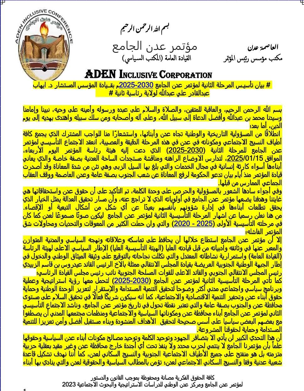 دعا مؤتمر عدن الجامع اليوم في بياناً صحفياً شديد اللهجة الحكومة إلى رفع العقاب الجماعي بحق ابناء العاصمة عدن والجنوب بشكل عام. وجاء في البيان بسم الله الرحمن الرحيم، والعاقبة للمتقين، والصلاة والسلام على عبده ورسوله وأمينه على وحيه، نبينا وإمامنا وسيدنا محمد بن عبدالله وأفضل الدعاة إلى سبيل الله، وعلى آله وأصحابه ومن سلك سبيله واهتدى بهديه إلى يوم الدين، أما بعد؛ انطلاقًا من المسؤولية التاريخية والوطنية تجاه عدن وأبنائها، واستشعارًا منا للواجب المشترك الذي يجمع كافة أطياف النسيج الاجتماعي ومكوناته في عدن في هذه المرحلة الدقيقة والعصيبة، انعقد الاجتماع التأسيسي لمؤتمر عدن الجامع للمرحلة الثانية(2025-2030) الذي دعت إليه هيئة رئاسة المؤتمر اليوم الثلاثاء، الموافق 2025/01/21، لتدارس الاوضاع الراهنة ومناقشة مستجدات الساحة العدنية بصفة خاصة والذي يعاني أبناءها أسوأ كارثة إنسانية في مجال الخدمات والتي بلغ بها السيل الزبى وهي تئن من شدة المعاناة وقد أصدرت قيادة المؤتمر منذ أيام بيان تدعو الحكومة لرفع المعاناة عن شعب الجنوب بصفة عامة وعدن العاصمة ووقف العقاب الجماعي الممارس من قبلها. وفي أجواء سادها الشعور بالمسؤولية والحرص على وحدة الكلمة، تم التأكيد على أن حقوق عدن واستحقاقاتها هي غايتنا وهدفنا يضعها مؤتمر عدن الجامع في أولوياته الذي لا تراجع عنه، وأن مسار تحقيق العدالة يمثل الخيار الذي يحقق تطلعات أبناءها في إدارة شؤونهم بأنفسهم بعيدًا عن أي شكل من أشكال التبعية أو الإقصاء. من هنا نعلن رسميا عن إشهار المرحلة التأسيسية الثانية لمؤتمر عدن الجامع ليكون صوتًا مسموعًا لعدن كما كان في مرحلته التأسيسية الأولى (2020 - 2025) والتي وأن حملت الكثير من المعوقات والتحديات ومحاولات شق المؤتمر الفاشلة؛ إلا أن مؤتمر عدن الجامع استطاع خلالها أن يحافظ على تماسكه وعلاقاته ونهجه السياسي والمدنية المتوازن والمعبر عنها في وثائقه وادبياته من قبل قيادته العليا (الهيئة التأسيسية العليا) الإطار السياسي الاعلى لهيئة الرئاسة (القيادة العامة) واستمرارية نشاطاته المعتدل والتي تكللت نجاحاته بالتوقيع على وثيقة الميثاق الوطني والدخول في إطار الجبهة الوطنية الجنوبية العريضة بقيادة المجلس الانتقالي ممثلة بالاخ الرئيس القائد عيدروس بن قاسم الزٌبيدي رئيس المجلس الانتقالي الجنوبي والقائد الاعلى للقوات المسلحة الجنوبية نائب رئيس مجلس القيادة الرئاسي؛ كما تأتي المرحلة التأسيسية الثانية لمؤتمر عدن الجامع (2025-2030) لتحمل معها رؤية استراتيجية وعملية وبرنامج سياسي واجتماعي مدني أكثر وضوحا لتحقيق التنمية المستدامة والإستقرار لتعزيز الوحدة الوطنية وحماية حقوق أبناء عدن وتحفيز التنمية الاقتصادية والاجتماعية، كما انه سيكون شريكًا فعالًا في تحقيق السلام على مستوى العاصمة عدن والجنوب بصفة عامة والتي تعتبر نقطة تحول في تاريخ مؤتمر عدن الجامع. وناشد الاجتماع التأسيسي الثاني لمؤتمر عدن الجامع أبناء العاصمة عدن ومكوناتها السياسية والاجتماعية ومنظمات مجتمعها المدني أن يصطفوا مع بعضهم البعض سياسيا على أسس صحيحة لتحقيق الأهداف المنشودة وبناء مستقبل أفضل وأمن تعزيزا للتنمية المستدامة وحماية لحقوقنا المشروعة. أن هذا التحدي الكبير لن يأتي الا بتضافر الجهود وتوحيد الكلمة وتوحيد مصالح مكونات أبناء عدن السياسية وحقوقها علماً بأن مؤتمرنا الجامع لا ينتمي لحزب محدد ولا ينفذ تحت أي أجندة خارج العاصمة عدن وغير مقيد بعقلية حزبية متزمتة بل هو منفتح على جميع الأطياف الاجتماعية الجنوبية والنسيج السكاني لعدن. كما أننا نهدف تشكيل قاعدة شعبية عدنية وفقا والنسيج السكاني الاجتماعي لعدن؛ تؤمن بالمطالب السياسية والحقوقية لعدن والتي ينادي بها أبناء عدن ونشر الوعي معتمداً على عدالة المطالب التي يتبناها كل ابناء عدن. إن إعلاننا اليوم للمرحلة الثانية يعتبر خطوة تاريخية نحو تحقيق الوحدة والتنمية في العاصمة عدن الع