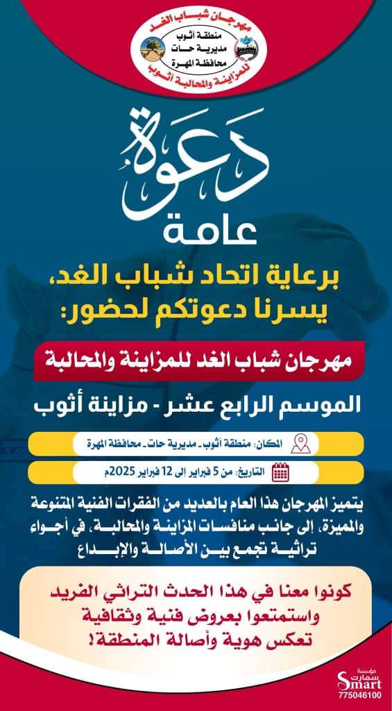 دعا شباب الغد بمحافظة المهرة، جميع أبناء المحافظة للمشاركة والحضور في مهرجان شباب الغد للمزاينة والمحالبة للموسم الرابع عشر - مزاينة أثوب. وحدد شباب الغد الراعي للمهرجان مكان إقامة المهرجان في منطقة أثوب - مديرية حات - محافظة المهرة والذي سبيدأ من 5 فبراير 2025م إلى 12 فبراير 2025م. الجدير ذكره أن المهرجان لهذا العام سوف يتميز بالعديد من الفقرات الفنية المتنوعة والمميزة، إلى جانب منافسات المزاينة والمحالبة، في أجواء تراثية تجمع بين الأصالة والإبداع. حيث ستكون عروض فنية وثقافية تعكس هوية وأصالة المهرة.