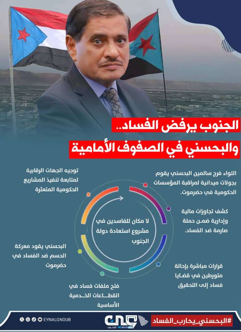 الحقيقة التي لا تخفى على أحد، حيث أن الوضع الاقتصادي في الجنوب يمر بتحديات كبيرة، من تدهور الأوضاع الاقتصادية والخدمية في العاصمة عدن والجنوب بشكل عام. ومن بين التحديات الاقتصادية التي تواجه الجنوب، تدهور الوضع الاقتصادي والذي يُعتبر من أهم التحديات التي تواجه شعب الجنوب، والذي يُؤثر على مستوى المعيشة للأفراد والأسرة. كما أن هناك تحديات أخرى منها الخدمية والتي تواجه العاصمة عدن والجنوب بما في ذلك نقص الخدمات الأساسية مثل الكهرباء والمياه.وتزامنًا مع تحركات اللواء الركن فرج سالمين البحسني، نائب رئيس المجلس الانتقالي الجنوبي، عضو مجلس القيادة الرئاسي، والهادفة إلى القضاء على الفساد المستشري في حضرموت. جنوبيون أكدوا على أن الجنوب يرفض كافة أشكال الفساد. مشيدين بجهود اللواء البحسني الرامية إلى تعزيز الشفافية والمساءلة، وتحقيق العدالة والاستقرار في المجتمع. مشيرين بأن نائب الرئيس فرج البحسني كقائد جنوبي صلب يقود معركة ضد الفساد، وتعزيز الالتفاف الشعبي حوله وحول المشروع الوطني الجنوبي الذي يقوده المجلس الانتقالي الجنوبي بقيادة الرئيس القائد عيدروس الزٌبيدي لاستعادة دولة الجنوب كاملة السيادة على حدودها المتعارف عليها دوليا قبل عام 1990م. حيث يتعرض الجنوب لعمليات تهريب النفط والديزل والتي تم اكتشافها في محافظة حضرموت، والتي أكدت على تورط قوى الاحتلال والإرهاب والفساد اليمني في نهب ثروات الجنوب. مؤكدين بأن حجم الأضرار الاقتصادية الناجمة عن الفساد، وسرقة الموارد أثرت على الخدمات العامة مثل الكهرباء والمياه والتعليم والصحة. وأكد مراقبون في الجنوب بأن اللواء الركن فرج سالمين البحسني عضو مجلس القيادة الرئاسي - نائب رئيس المجلس الانتقالي الجنوبي يعتبر قائد لا يخضع للضغوط السياسية، ويضع مصلحة المواطنين فوق كل الاعتبارات. كاشفين شبكات الفساد المتغلغلة في المؤسسات الحكومية، والتي تحاول عرقلة جهود استكمال بناء وتفعيل مؤسسات الدولة في حضرموت ضمن خطوات إنهاء ارتباطها بمنظومة صنعاء المالية والادارية والسياسية. مضيفين بأن المجلس الانتقالي الجنوبي بقيادة الرئيس القائد عيدروس الزٌبيدي يدعم بقوة في محاربة الفساد وهو أحد الشروط الرئيسية التي وضعها الرئيس القائد الزٌبيدي لأكثر من مرة في مختلف خطاباته ولقاءاته مع عدد من اللقاءات الصحفية. نشطاء وإعلاميون في الجنوب دعوا أبناء حضرموت والجنوب عامة إلى التوعية بأهمية مكافحة الفساد، وربطها بحماية الأمن القومي الجنوبي واستقرار حضرموت. مجددين التأكيد على أن مكافحة الفساد ليست قضية شخصية، بل مسؤولية وطنية تهدف لحماية مقدرات شعب الجنوب. حيث دعم المجلس الانتقالي الجنوبي بمحافظة حضرموت، إجراءات النائب البحسني لمكافحة بؤر الفساد، وأكد على ضرورة محاسبة الفاسدين ومن يقف وراء عمليات تهريب النفط والديزل بطرائق غير القانونية. وأضافوا بأن قوى الشمال وأدواتها التي تحاول تشويه جهود نائب الرئيس فرج سالمين البحسني، وربطها بمصالح غير مشروعة مرتبطة بلوبيات الفساد اليمني التي اكتسبتها بعد حرب صيف يوليو 1994م. تفاعل جنوبي مع اللواء البحسني: اطلق ناشطون وسياسيون جنوبيون هاشتاج #البحسني_يحارب_الفساد على منصات التواصل الاجتماعي أشهرها (أكس) وذلك عصر اليوم الإثنين 3 فبراير / شباط 2025م. وتزامن الهاشتاج مع تحركات اللواء الركن فرج سالمين البحسني، نائب رئيس المجلس الانتقالي الجنوبي، عضو مجلس القيادة الرئاسي، والهادفة إلى القضاء على الفساد المستشري في حضرموت. وأكدوا على أن الجنوب يرفض كافة أشكال الفساد. وأشاروا إلى أهمية دعم المجلس الانتقالي الجنوبي بقيادة الرئيس القائد عيدروس الزٌبيدي وتوجهه لمحاربة الفساد وهو احد الشروط الرئيسية التي وضعها الرئيس القائد لاكثر من مرة في مختلف خطاباته ولقاءاته مع عدد من اللقاءات الصحفية. واشادوا بجهود اللواء البحسني الرامية إلى تعزيز الشفافية والمساءلة، وتحقيق العدالة والاستقرار في المجتمع. وقا