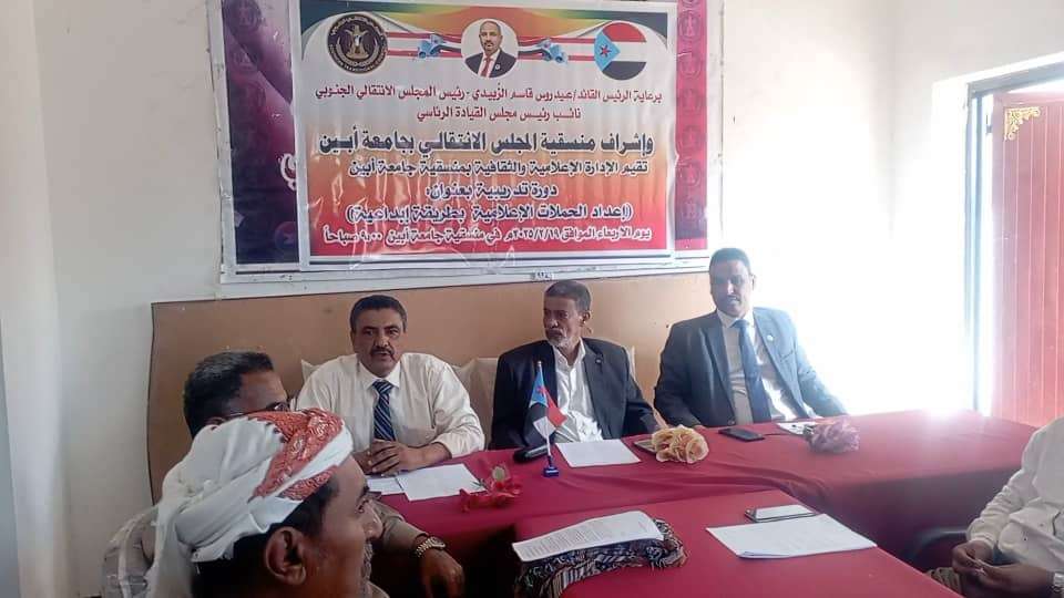 إدارة الإعلام والثقافة بمنسقية المجلس الانتقالي بجامعة أبين تنظم دورة تدريبية في إعداد الحملات الإعلامية بطريقة إبداعية